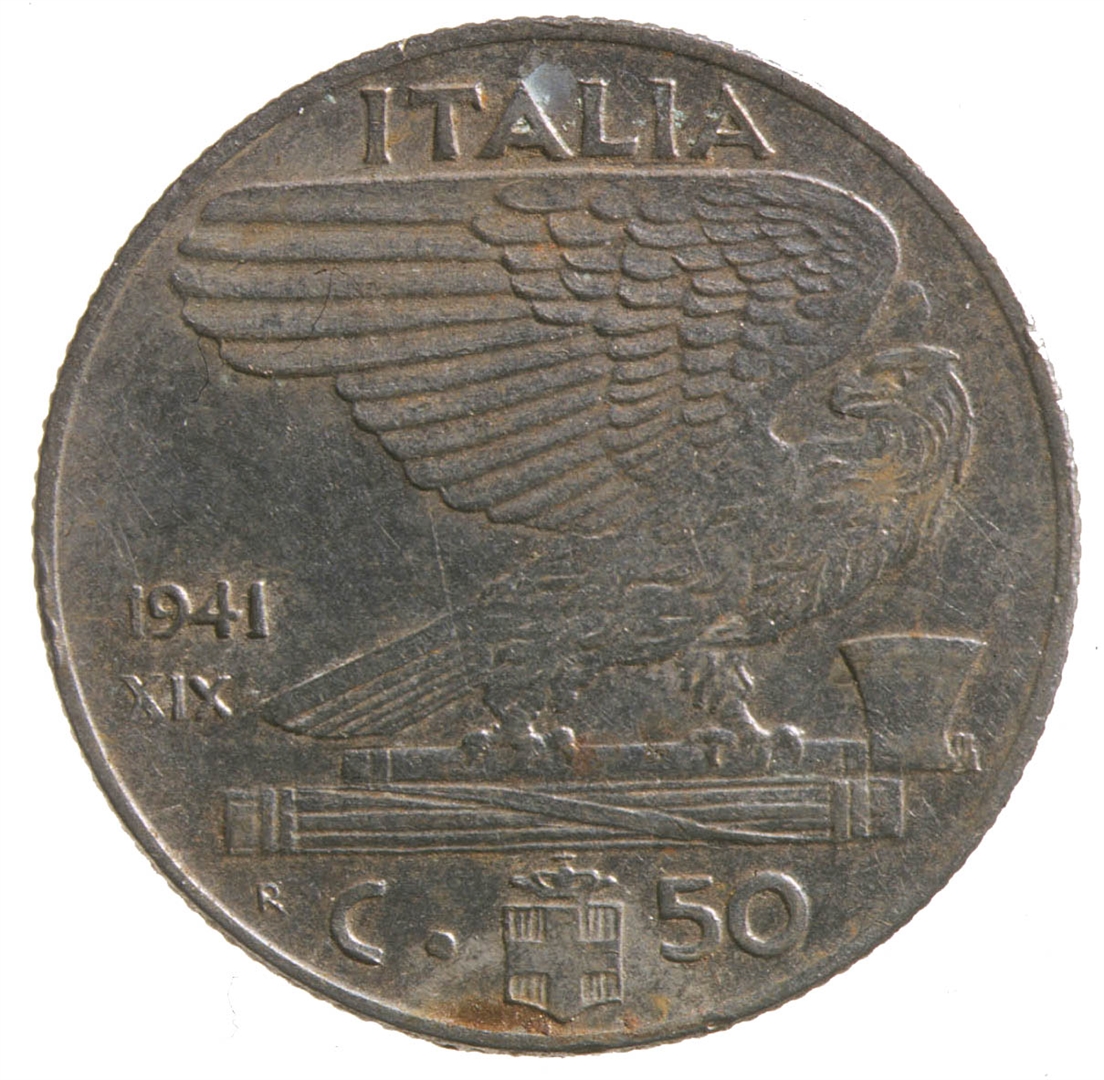 Centralni dio reversa zauzima prikaz orla raširenih krila koji u kanđama drži fascio. Iznad njega nalazi se natpis ITALIA, a sa njegove desne strane godina 1941 i rimski broj XIX. U dnu na sredini nalazi se grb s čije se desne strane nalazi broj 50, a sa lijeve strane slovo C. Lijevo od slova C nalazi se malo slovo R.