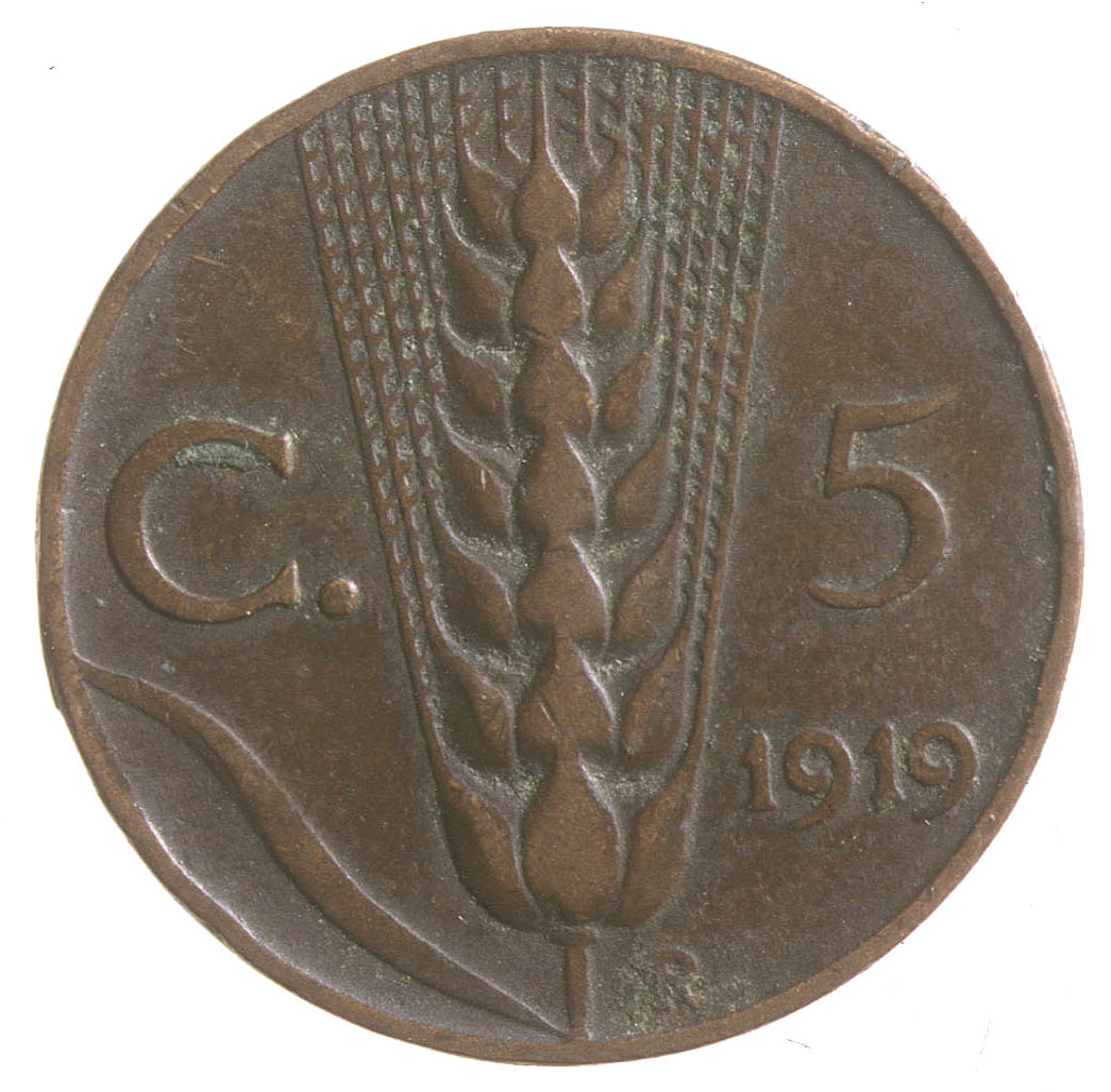 Avers: Centralni dio kovanice zauzima profil muške osobe sa pogledom u lijevo. Kružno uz rub kovanice proteže se natpis VITTORIO. EMANUELE. III. RE. D''ITALIA. Na dnu uz rub kovanice nalazi se natpis A. MOTTI. Revers: Centralni dio reversa zauzima klas pšenice sa čoje se lijeve strane nalazi slovoC, a sa desne broj 5. Ispod broja 5 godina 1919, a u samom dnu slovo R.
