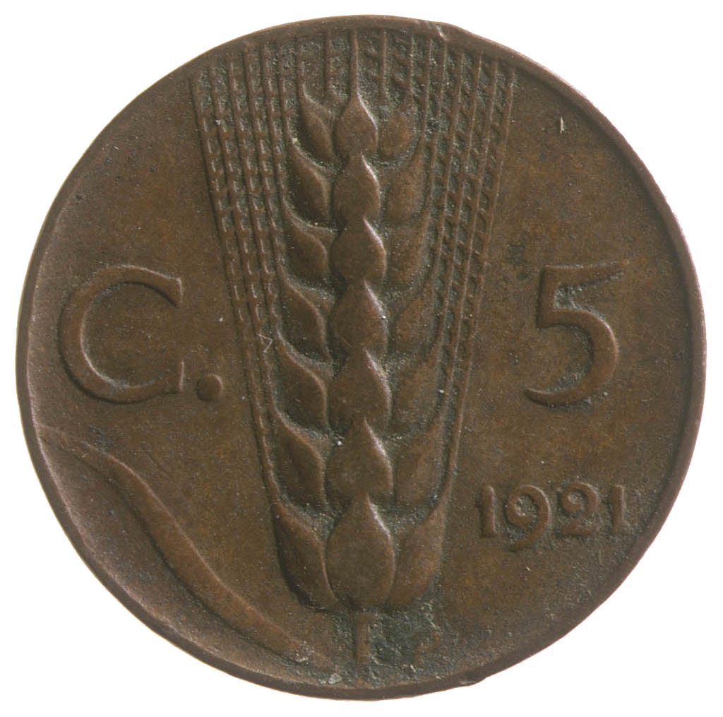 Avers: Centralni dio kovanice zauzima profil muške osobe sa pogledom u lijevo. Kružno uz rub kovanice proteže se natpis VITTORIO. EMANUELE. III. RE. D''ITALIA. Na dnu uz rub kovanice nalazi se natpis A. MOTTI. Revers: Centralni dio reversa zauzima klas pšenice sa čoje se lijeve strane nalazi slovoC, a sa desne broj 5. Ispod broja 5 godina 1921, a u samom dnu slovo R.