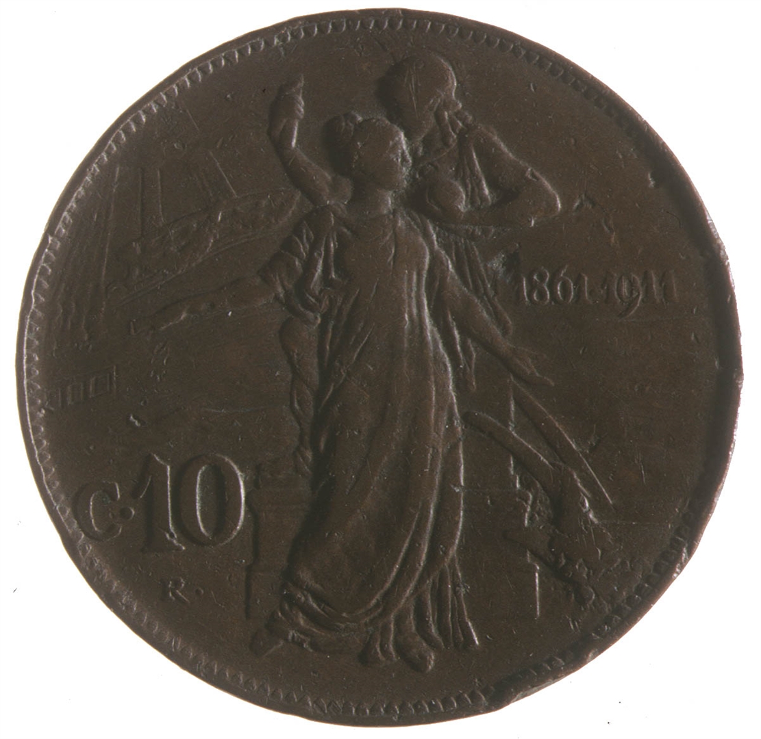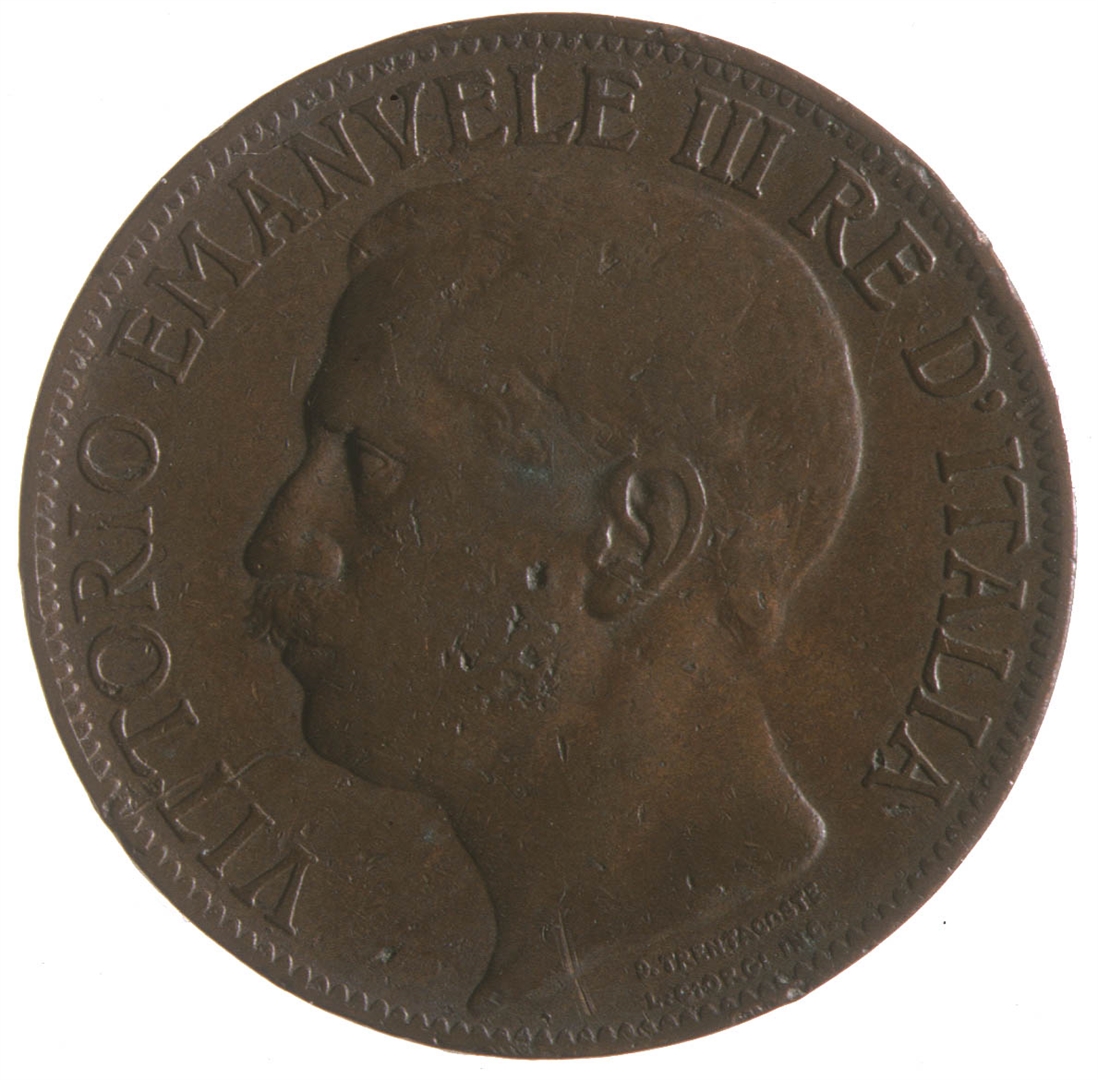 Avers: U sredini profil kralja s pogledom u lijevo. Oko ruba kovanice natpis VITTORIO EMANUELE III RE D''ITALIA. Ispod vrata natpis autora (D • TRENTACOSTE) i gravera (L • GIORGI INC •). Revers: U sredini dvije alegoriske osobe koje simboliziraju Italiju i grad Rim. U pozadini s lijeve strane trgovački jedrenjak ispod kojeg se nalazi oznaka crijednosti kovanice C.10 i slovo R oznaka kovnice.