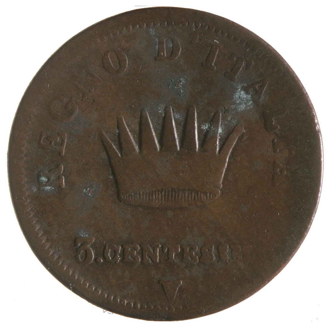 Revers: U sredini radijalna kruna. Iznad nje polukružni natpis REGNO D''ITALIA, a ispod krune oznaka vrijednosti 3. CENTESIMI i slovo V oznaka kovnice.