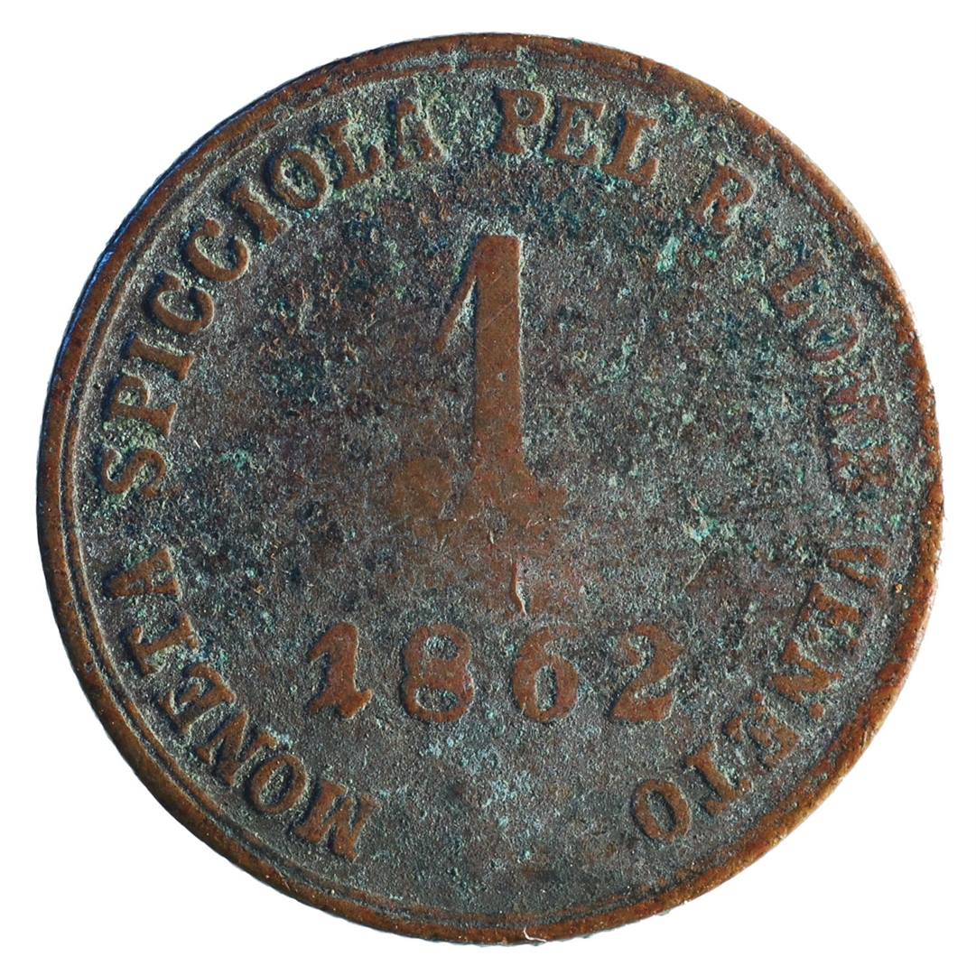 U sredini natpis u dva reda 1 / 1862. Uz rub natpis MONETA SPICCIOLA PEL R • LOMB VENETO.