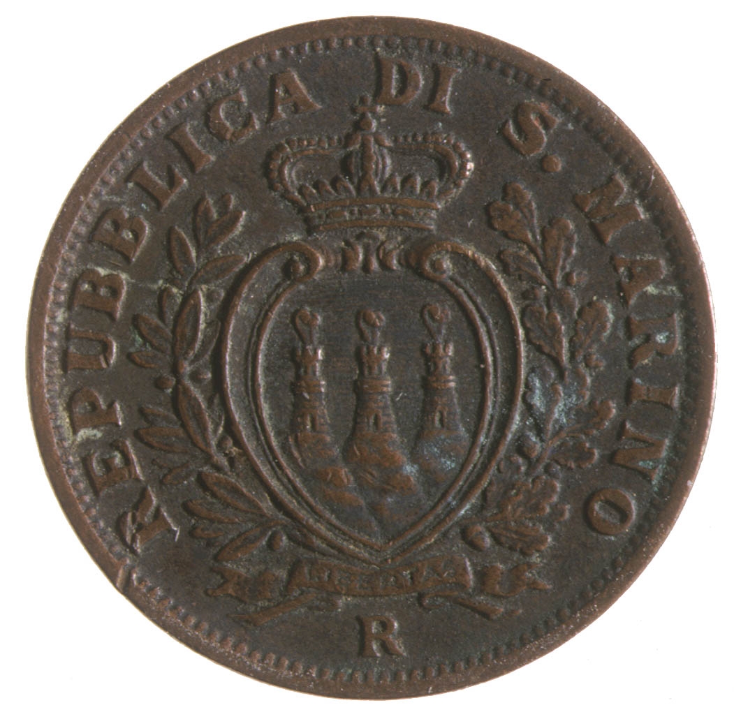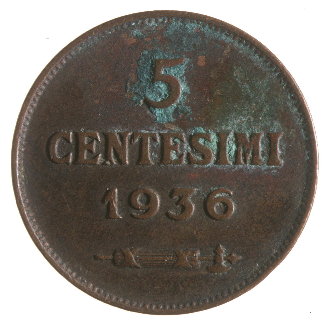 Avers: U sredini grb San Marina iznad kojeg se nalazi kruna. Oko ruba natpis REPUBBLICA DI S • MARINO., a na dnu ornaka kovnice R. Revers: U sredini natpis u tri reda 5 / CENTESIMI / 1936. ispod kojeg se bnapazi fascio sa sjekirom u vodoravnom položaju.