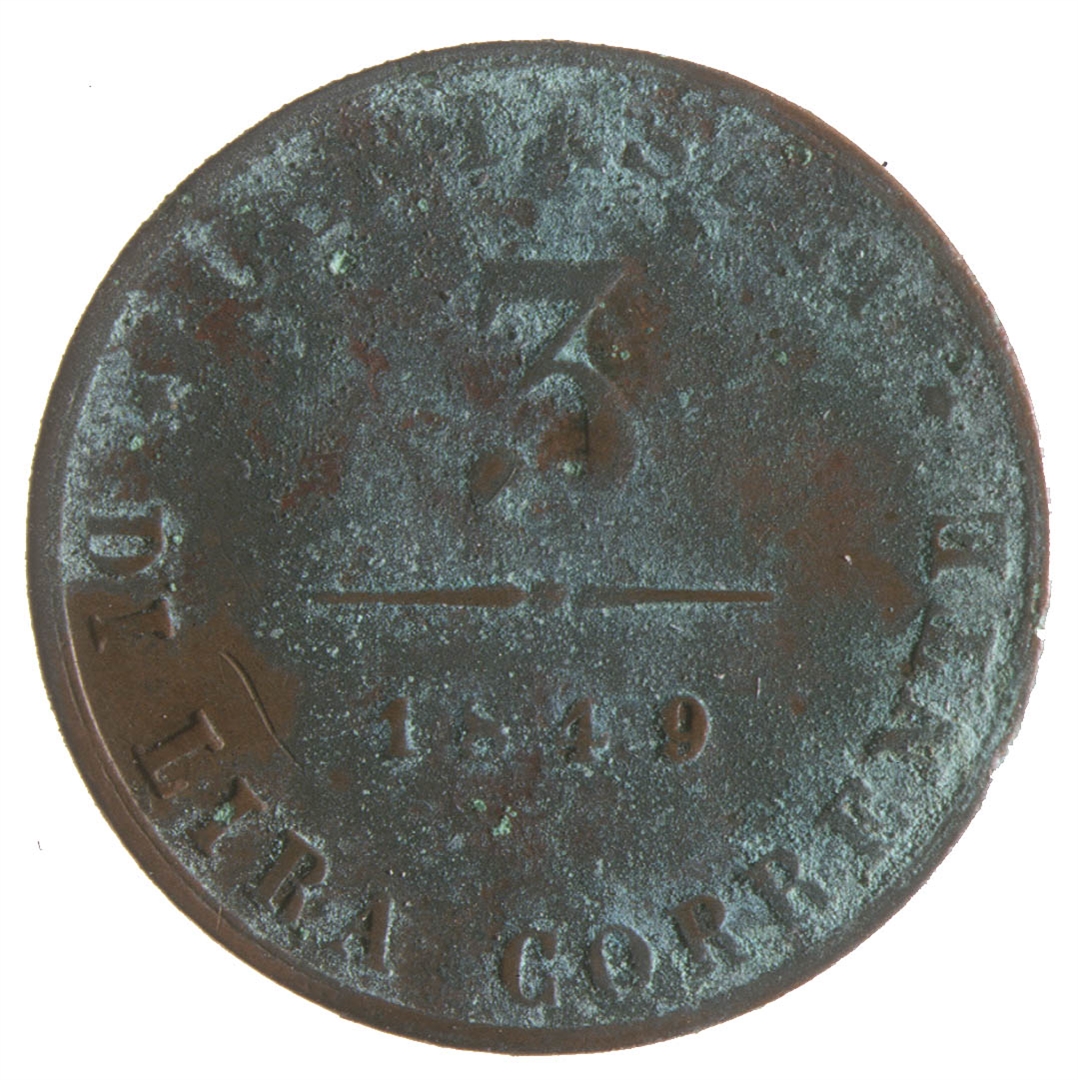 Avers: U sredini grb Sv. Marka a oko ruba natpis GOVERNO PROVVISORIO DI VENEZIA. Revers: U sredini u dva reda natpis 3 / 1849. Oko ruba natpis CENTESIMI DI LIRA CORRENTE.