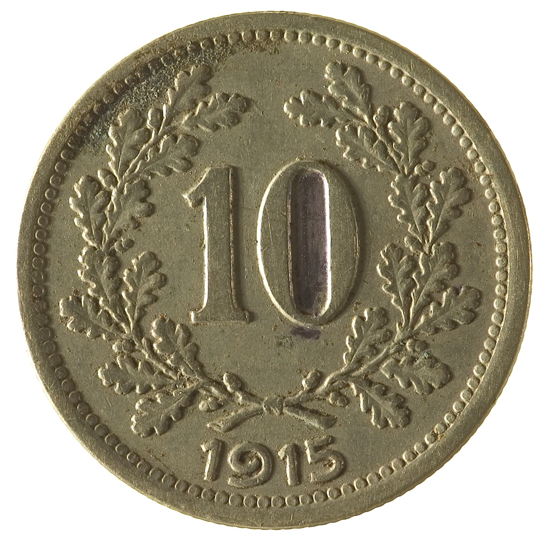 U sredini broj 10 , a oko njega dvije hrastove grančice. Na dnu godina kovanja 1915.