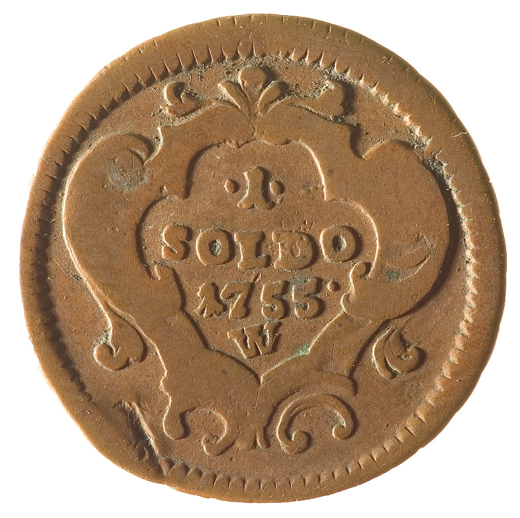 U sredini unutar ukrašenog okvira nalazi se oznaka vrijednosti novca 1 Soldo. Ispod nje nalazi se godina 1755 i oznaka kovnice W.