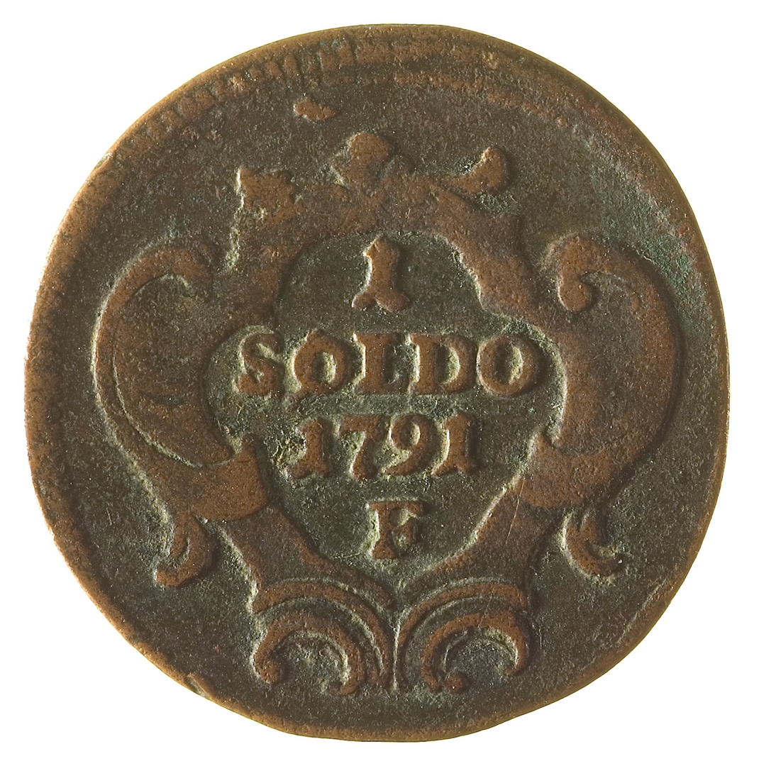 Avers: U sredini, unutar ukrašenog okvira iznad kojeg je kruna, nalazi se grb Gorice sa propetim lavom. Revers: U sredini unutar ukrašenog okvira nalazi se oznaka vrijednosti novca 1 Soldo. Ispod nje nalazi se godina 1791 i oznaka kovnice F.