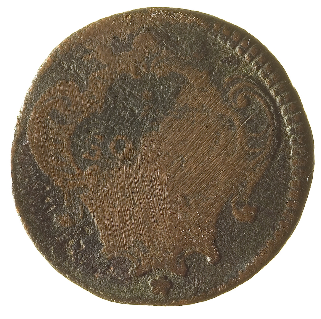 U sredini unutar ukrašenog okvira nalazi se oznaka vrijednosti novca 1 Soldo. Godina i oznaka kovnice nečitki.