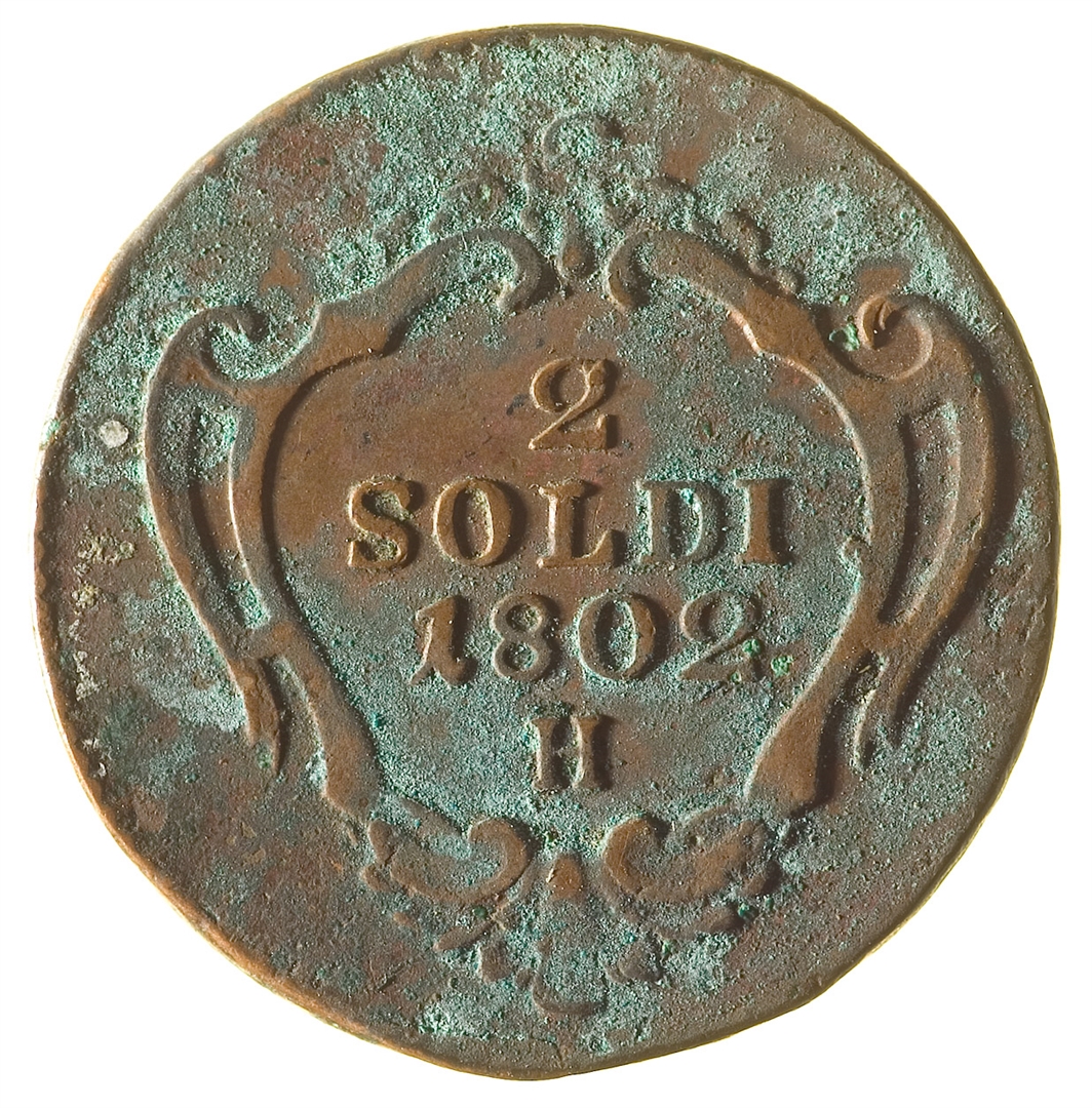 Avers: U sredini, unutar ukrašenog okvira iznad kojeg je kruna, nalazi se grb Gorice sa propetim lavom. Revers: U sredini unutar ukrašenog okvira nalazi se oznaka vrijednosti novca 2 Soldi. Ispod nje nalazi se godina 1802 i oznaka kovnice H.