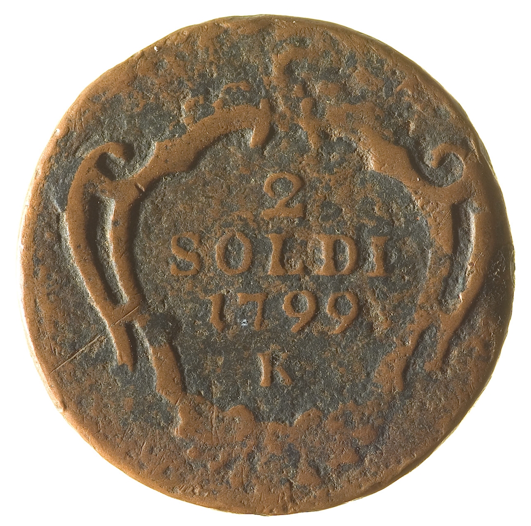 Avers: U sredini, unutar ukrašenog okvira iznad kojeg je kruna, nalazi se grb Gorice sa propetim lavom. Revers: U sredini unutar ukrašenog okvira nalazi se oznaka vrijednosti novca 2 Soldi. Ispod nje nalazi se godina 1799 i oznaka kovnice K.