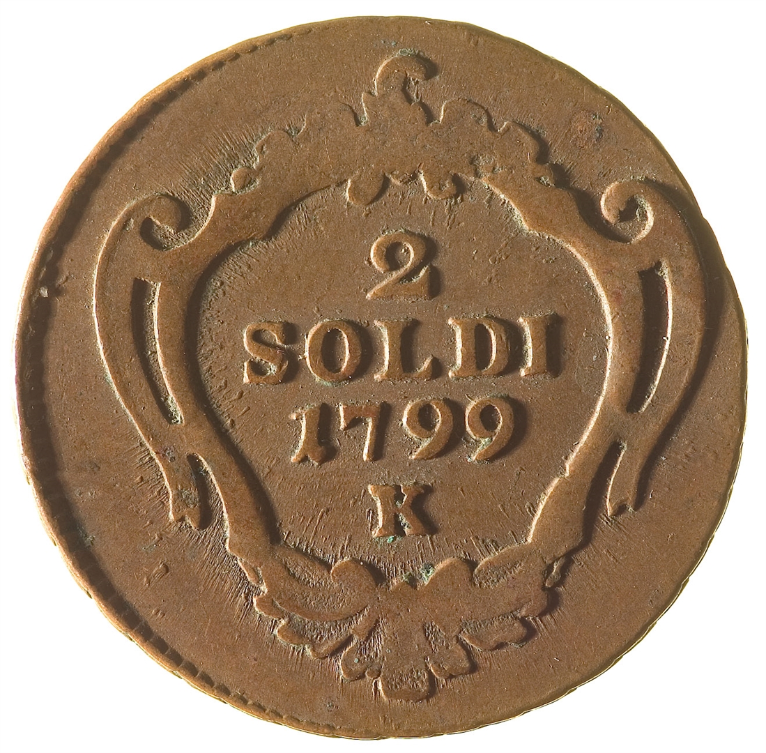 U sredini unutar ukrašenog okvira nalazi se oznaka vrijednosti novca 2 Soldi. Ispod nje nalazi se godina 1799 i oznaka kovnice K.