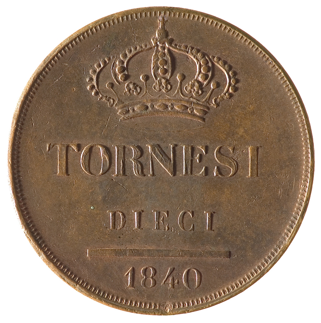 Avers: U sredini profil u desno. Uz rub kružni natpis FERDINANDUS II. D. G. REGNI VTR. SIC. ET HIER. REX Revers: Pri vrhu kraljevska kruna. Ispod nje u dva reda tekst TORENSI / DIECI. U egseru godina 1840.