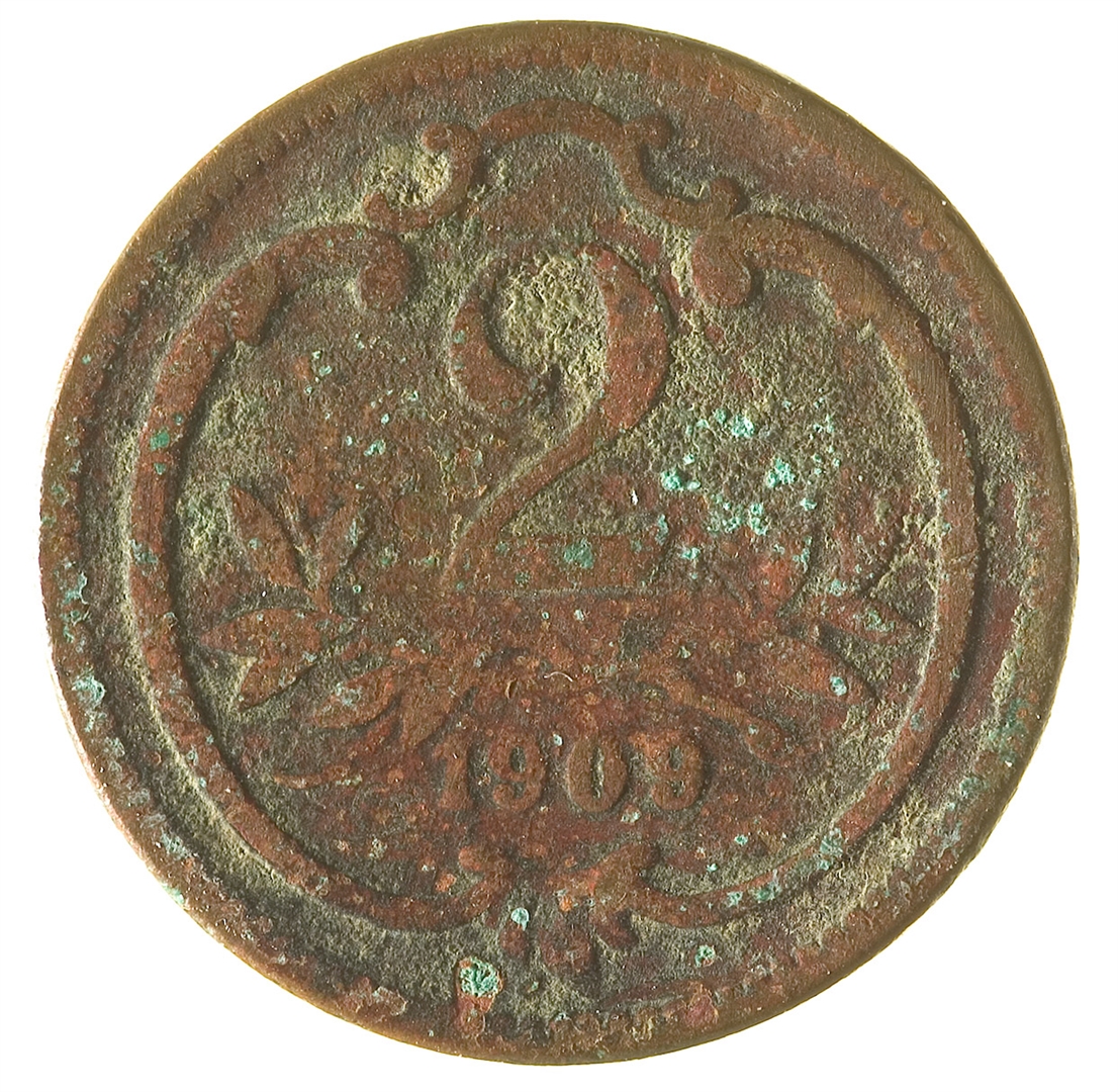 U gornjem djelu ovalnog okvira broj 2. Ispod njega maslinova grančica i godina kovanja 1909.