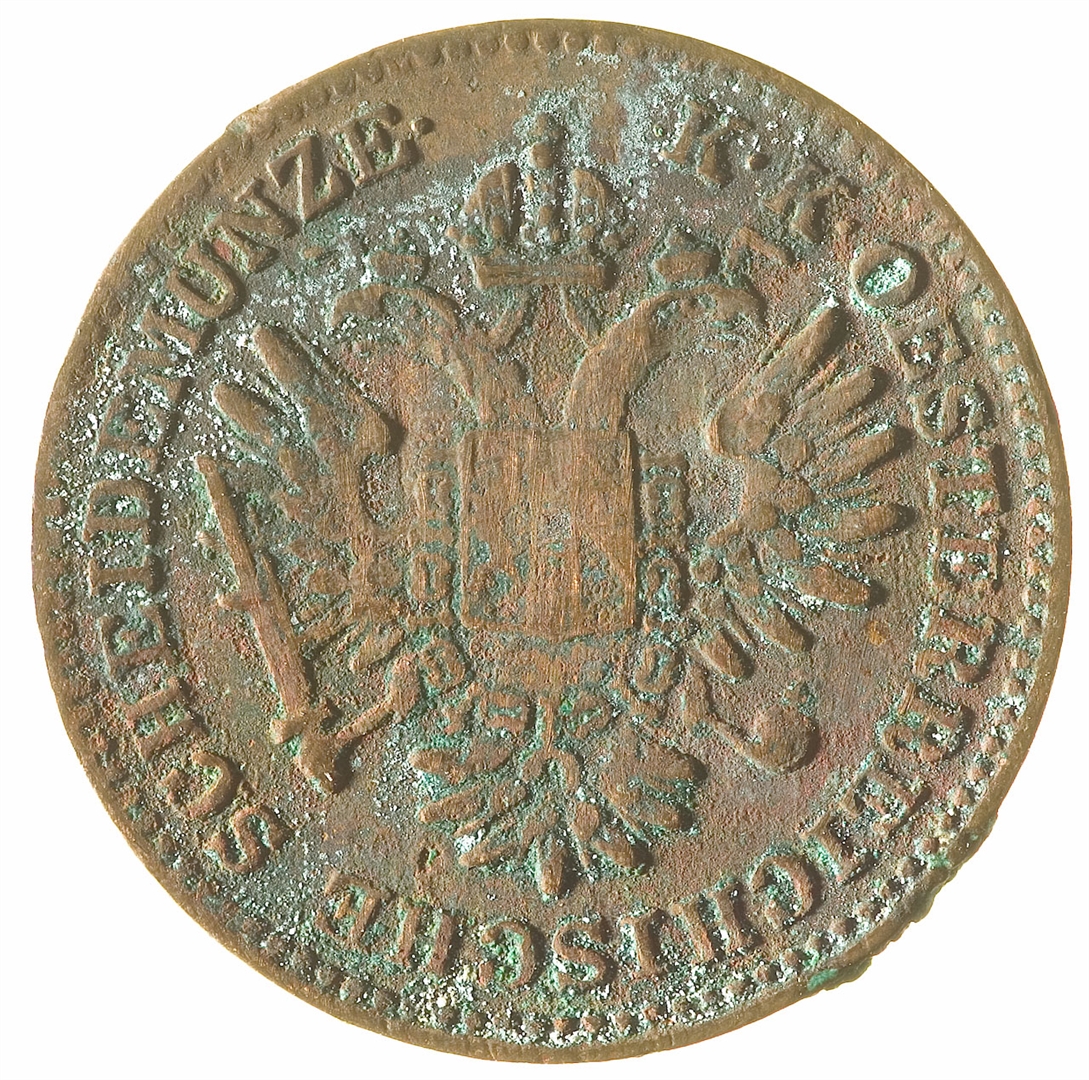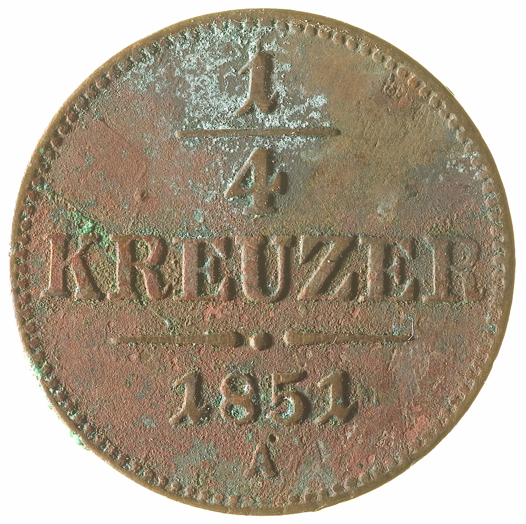 Avers: U sredini dvoglavi orao iznad kojeg se nalazi kruna. Uz rub natpis K·K·OESTERREICHISCHE SCHEIDEMÜNZE·. Revers: U sredini natpis u četiri reda 1 / 4 / KREUZER / 1851. Na dnu oznaka kovnice A.