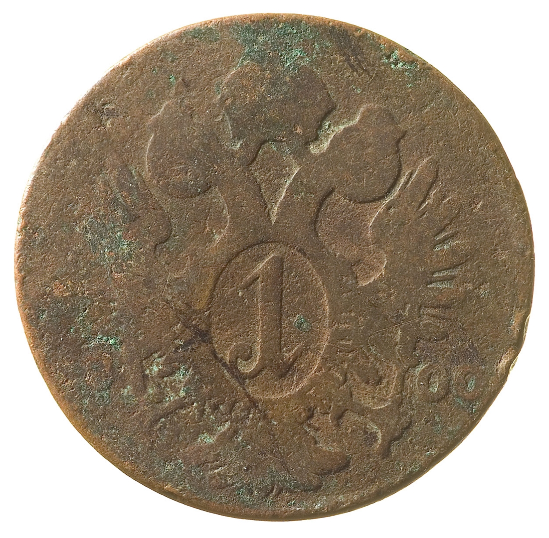 Centralni dio zauzima dvoglavi orao iznad kojeg se nalazi kruna (carski grb), a lijevo i desno od njega u dva dijela godina kovanja 18 i 00. U sredini nalazi se 1 (nominala).