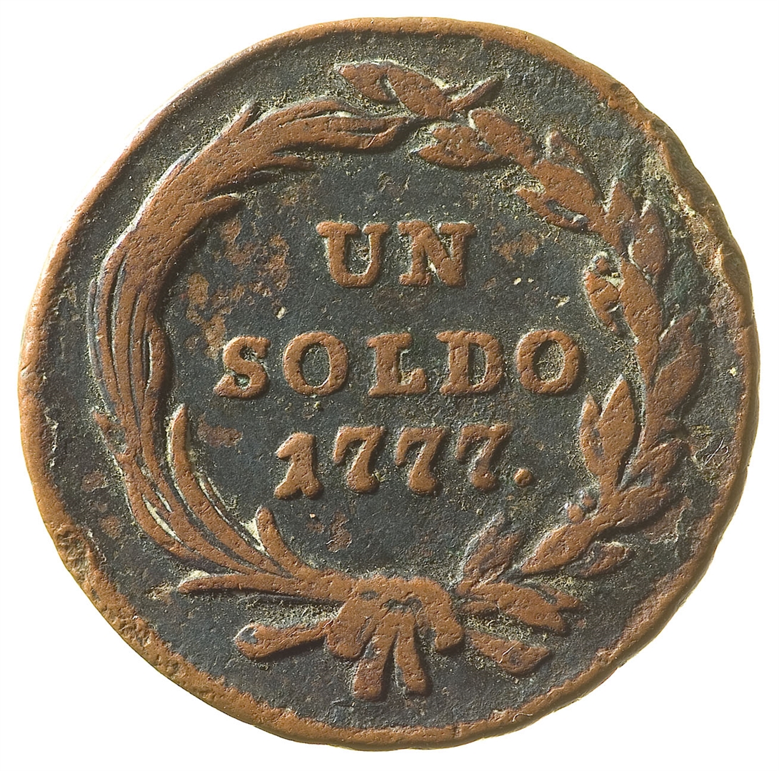 U sredini u tri reda natpis UN / SOLDO / 1777. Uokolo grane palme i stabla.