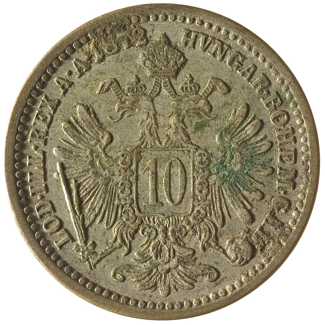 U središnjem djelu dvoglavi orao iznad kojeg se nalazi kruna, a u sredini broj 10 (nominala). Uz rub natpis HUNGAR·BOHEM·GAL·LOD·ILL·REX A·A·1872