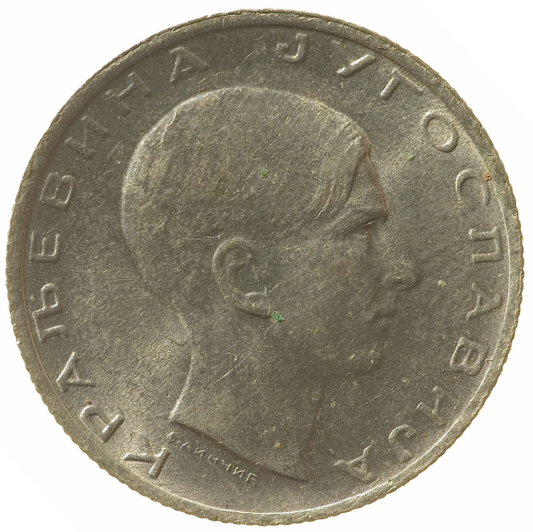 Avers: Profil kralja Ptera II s pogledom u desno. Uz rub novca natpis KRALJEVINA JUGOSLAVIJA na ćirilici. Revers: U sredini natpis u tri reda 10 / DINARA /1938. Iznad kruna, a uz rub cvijetni vjenac.