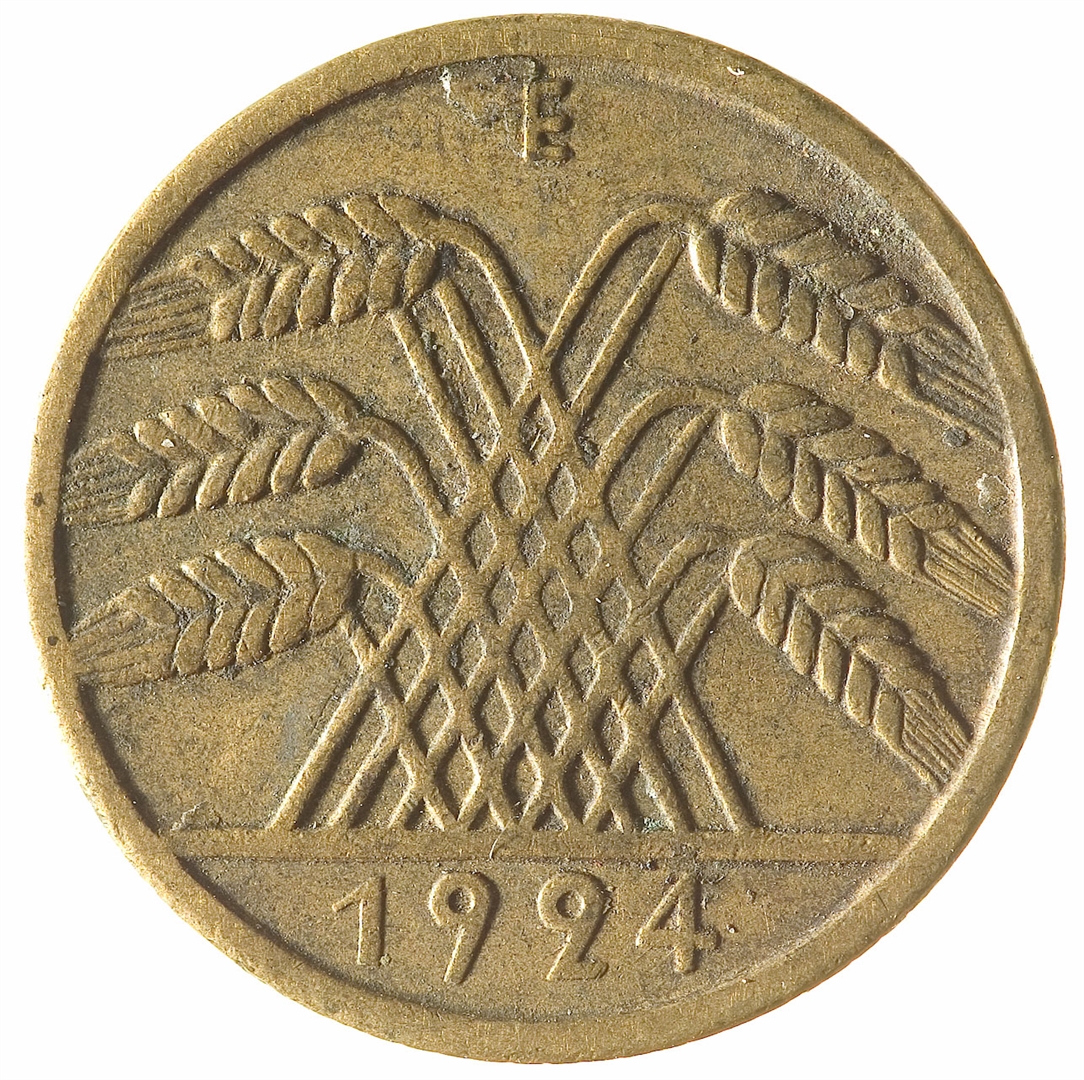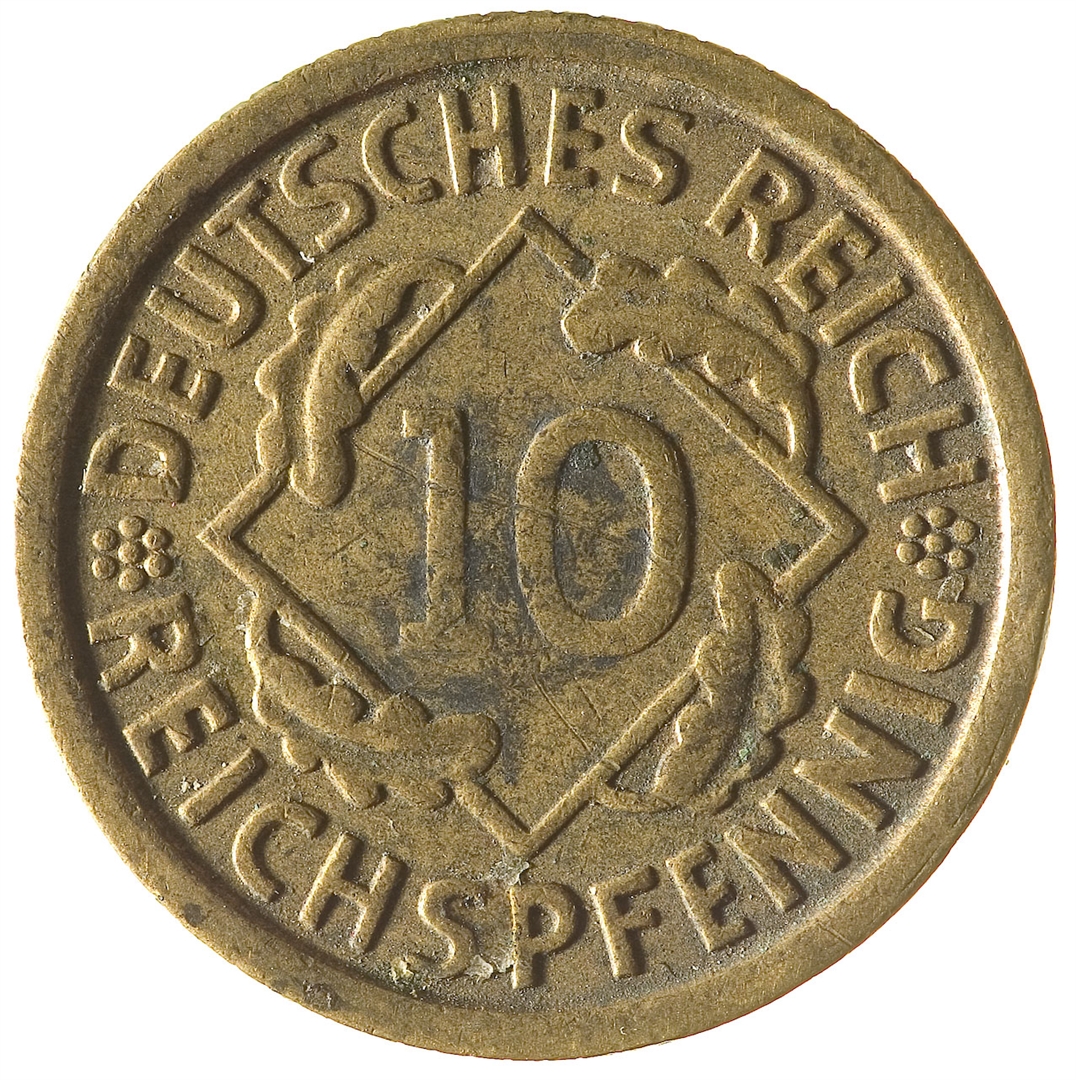 Avers: U sredini okvir oblika romba isprepleten sa 4 hrastova lista unutar kojeg se nalazi broj 10. Uz gornji rub natpis DEUTSCHES REICH, a uz donji REICHSPFENNIG. Revers: U sredini šest ukrižanih stabiljki pšenice. Iznad slovo E oznaka kovnice a u esergu godina kovanja 1924.