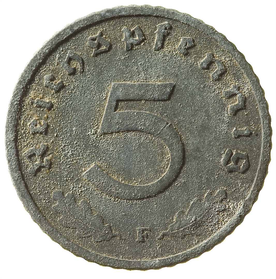 Revers: U sredini broj 5, a uz rub natpis Reichspfennig. Pri dnu između dva hrastova lista nalazi se oznaka kovnice F.