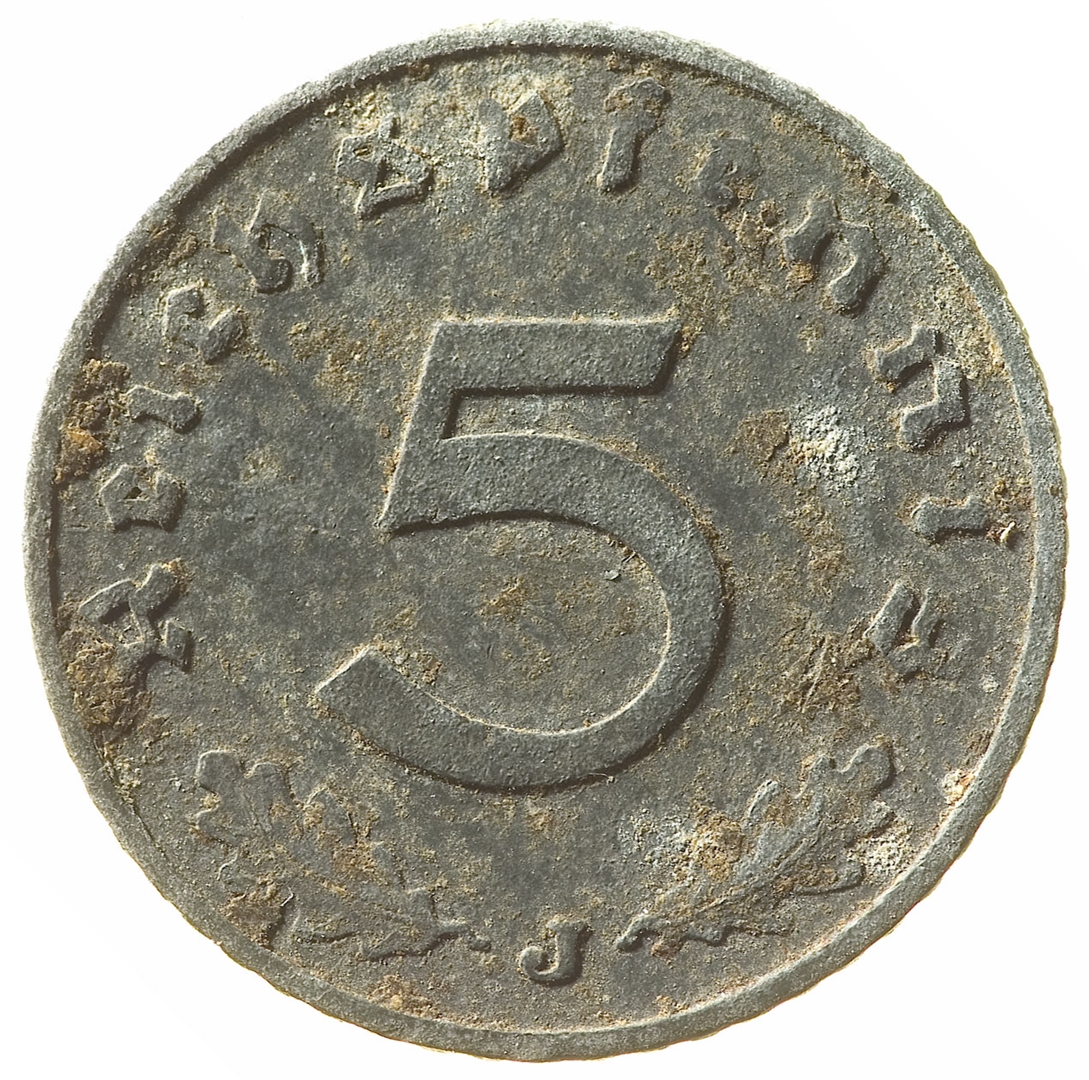 Revers: U sredini broj 5, a uz rub natpis Reichspfennig. Pri dnu između dva hrastova lista nalazi se oznaka kovnice J.