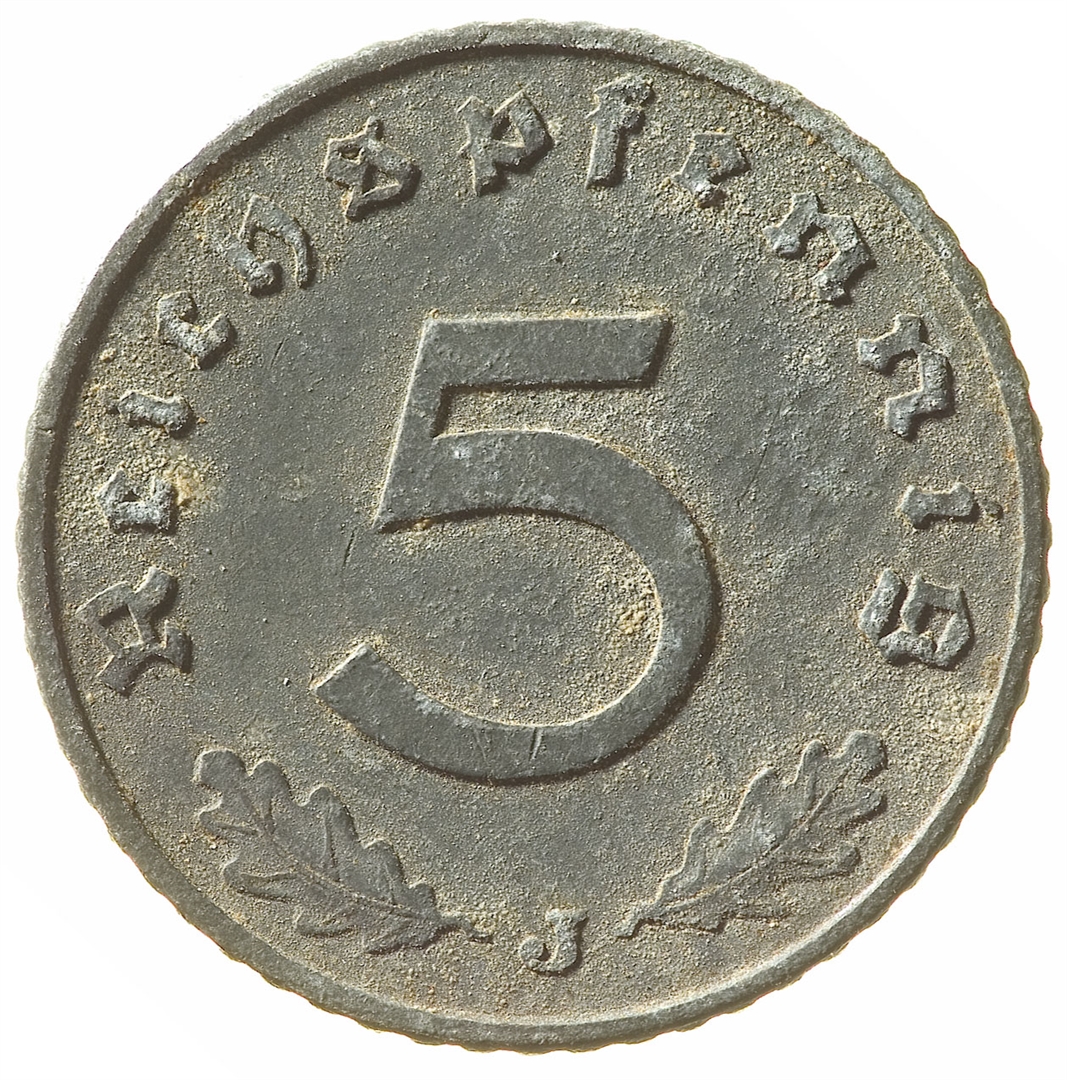 Revers: U sredini broj 5, a uz rub natpis Reichspfennig. Pri dnu između dva hrastova lista nalazi se oznaka kovnice J.