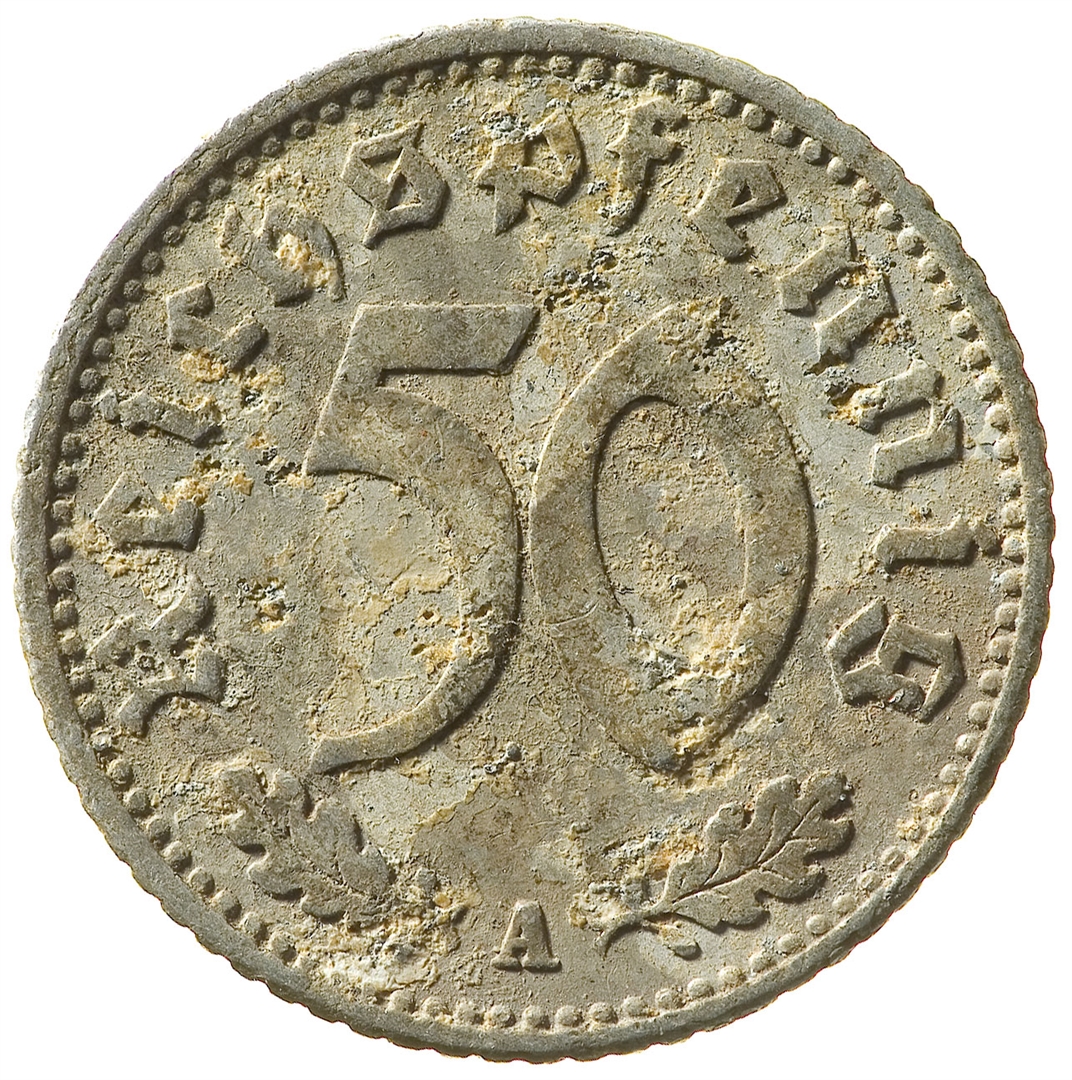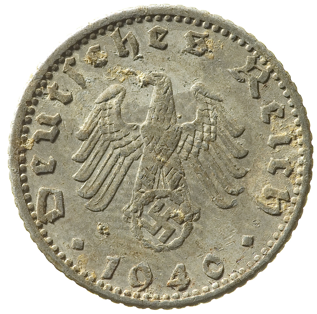 Avers: U sredini grb u obliku orla s raširenim krilima koji u kanđama drži kružni vijenac unutar kojeg se nalazi svastika. Oko ruba tekst Deutsches Reich a na dnu godina kovanja 1940. Revers: U sredini broj 50, a uz rub natpis Reichspfennig. Pri dnu između dva hrastova lista nalazi se oznaka kovnice A.