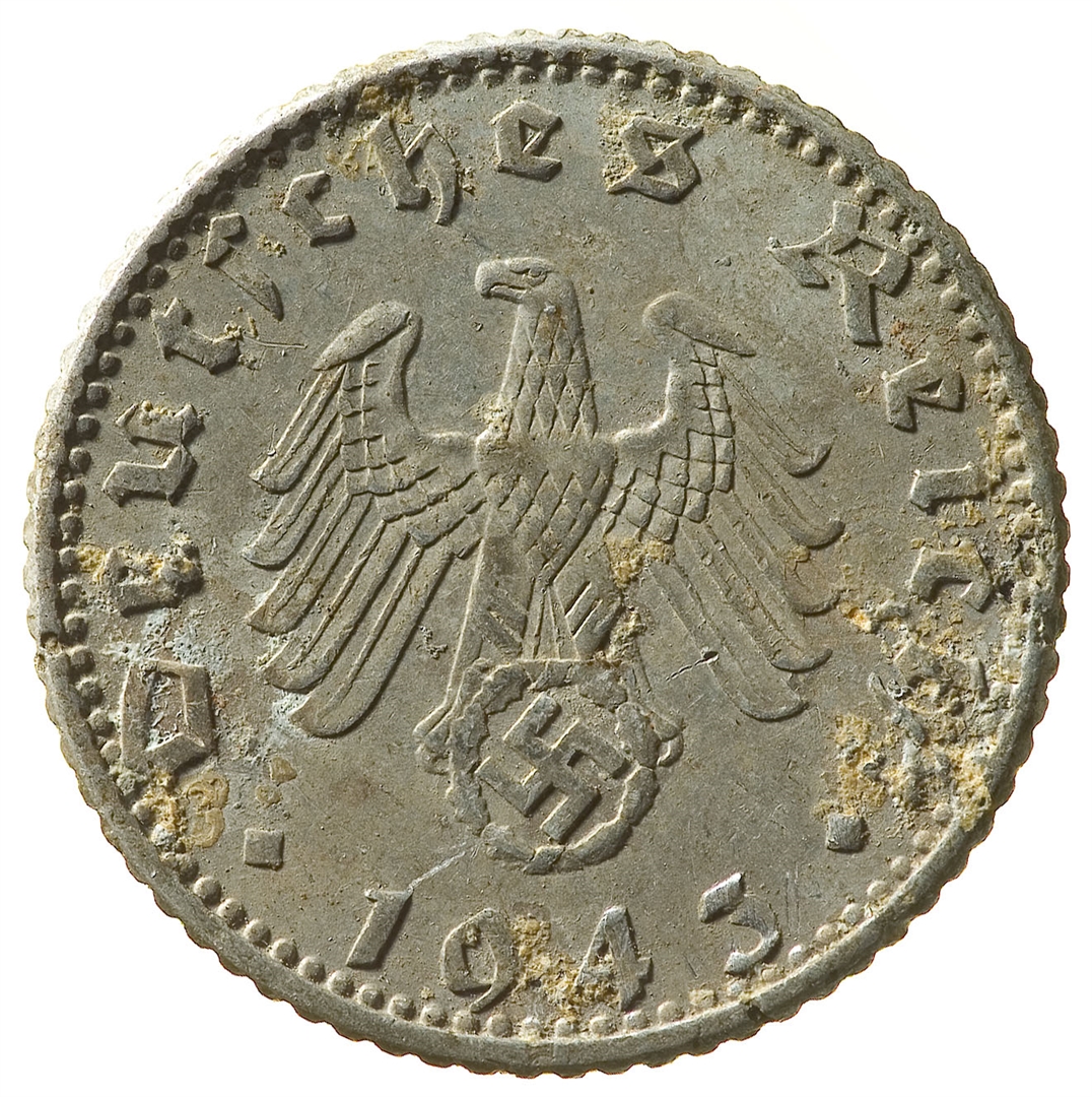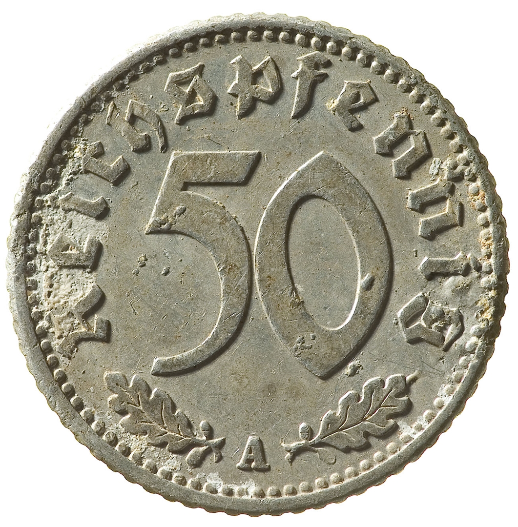 Avers: U sredini grb u obliku orla s raširenim krilima koji u kanđama drži kružni vijenac unutar kojeg se nalazi svastika. Oko ruba tekst Deutsches Reich a na dnu godina kovanja 1943. Revers: U sredini broj 50, a uz rub natpis Reichspfennig. Pri dnu između dva hrastova lista nalazi se oznaka kovnice A.