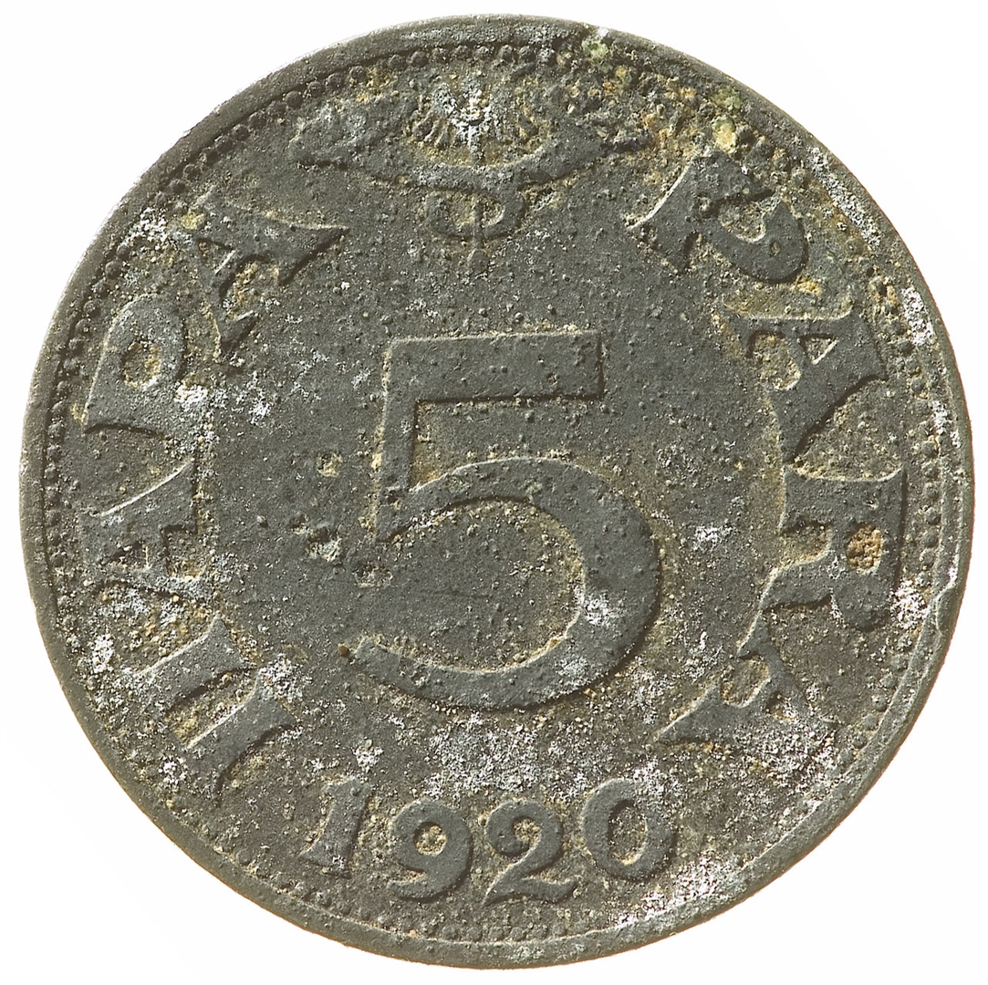 Avers: Državni grb. Revers: U sredini broj 5. Oko ruba natpis PARA na ćerilici i latinici. U dnu godina kovanja 1920.