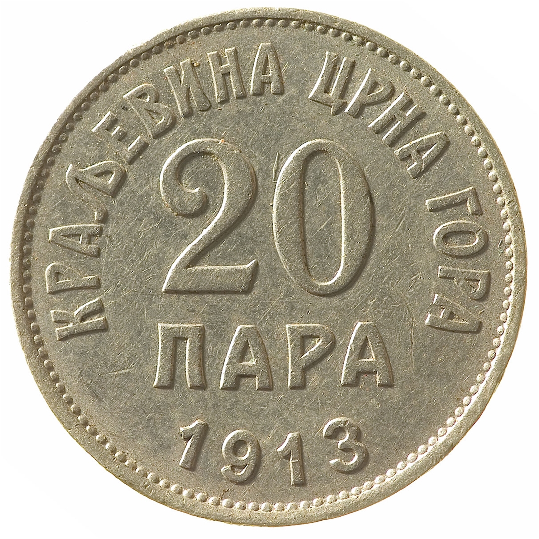 Avers: Grb Crne Gore. Revers: U sredini natpis u dva reda 20 / Para. Uz gornji rub novca natpis KRALJEVINA CRNA GORA, a u dnu godina kovanja 1913.