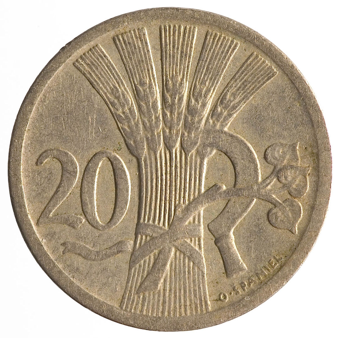 Avers: U središnjem djelu nalazi se grb Češke unutar kojeg se nalazi manji Slovački grb. Kružno uz rub kovanice nalazi se tekst REPUBLIKA+ČESKOSLOVENSKÁ. Ispod grba je godina kovanja. Revers: U sredini se nalazi prikaz snopa žita. Sa lijeve strane nalazi se broj 20, a sa desne strane srp. Uz donji rub nalazi se ime autora O·ŠPANIEL.