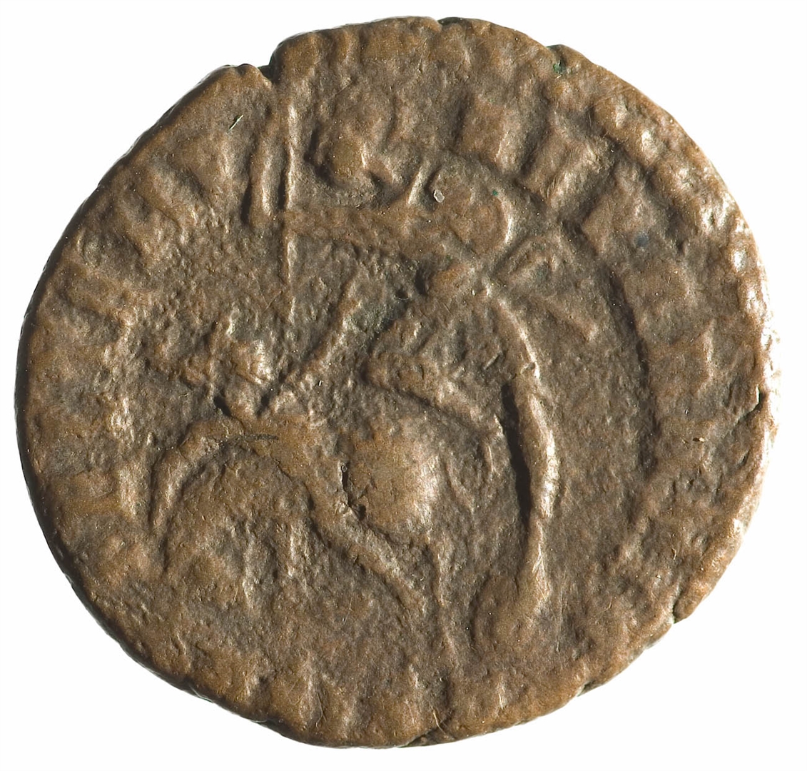 Avers: poprsje cara s dijademom i drapiranom odjećom, profil udesno, legenda djelomično nečitka; natpis: DN CONST-TIVS P F AVG Revers: car s kacigom na glavi i štitom u lijevoj ruci probada konjanika; natpis: FEL TEMP REPARATIO