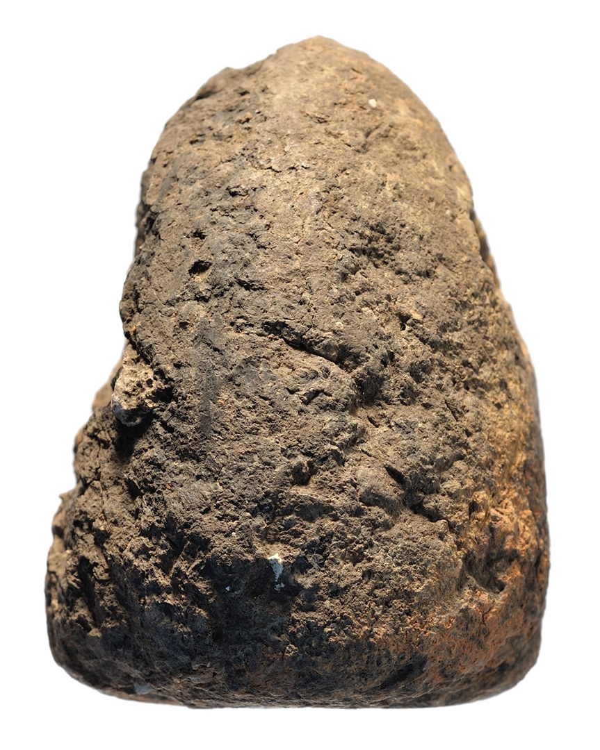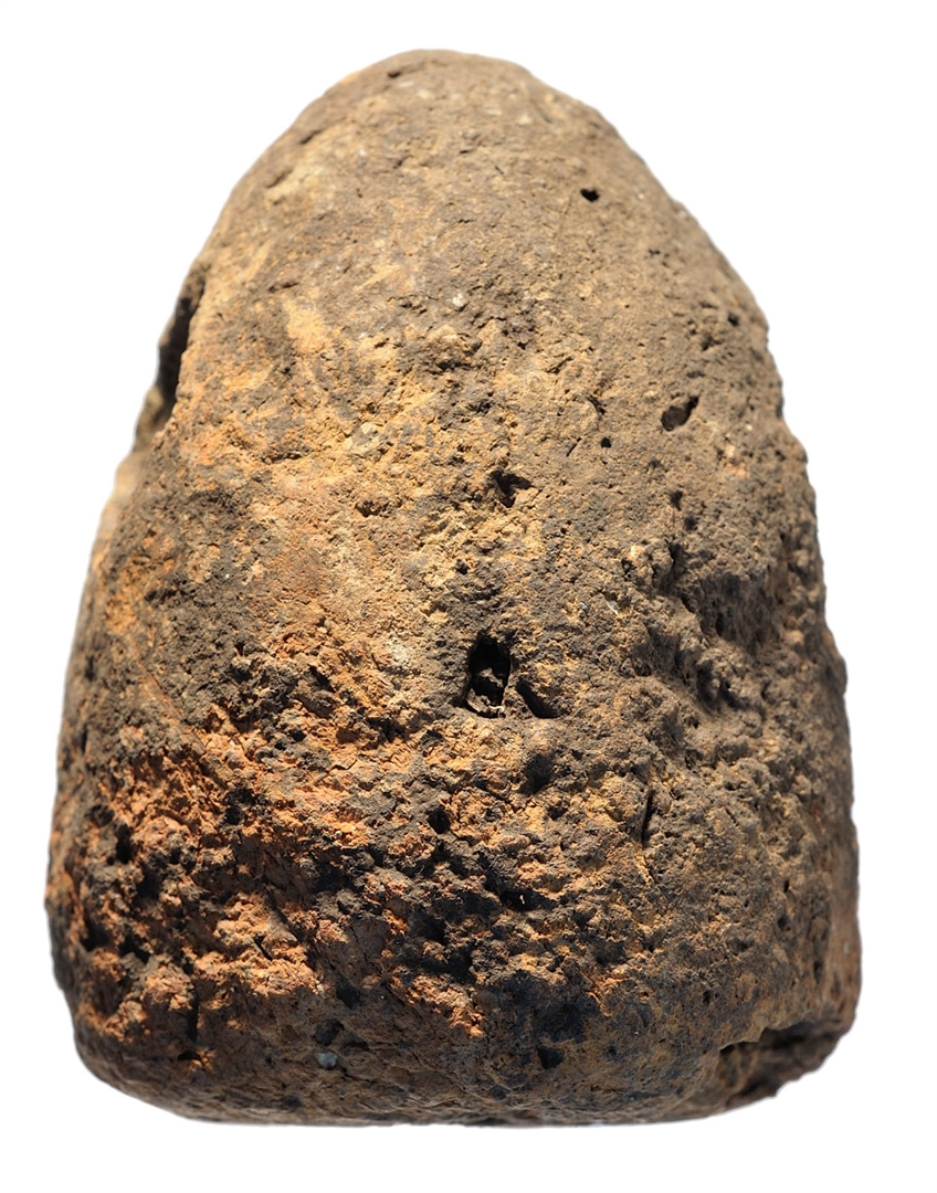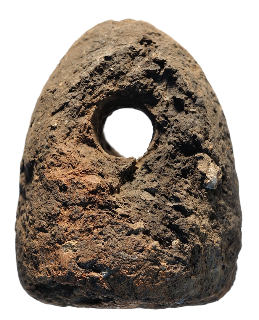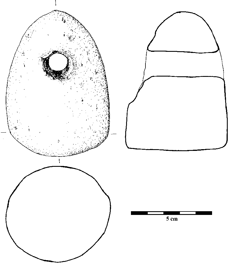 Keramički uteg. Jedan krak mu je zaobljen, a drugi ravnije oblikovan. U gornjoj polovici predmeta kružna perforacija.