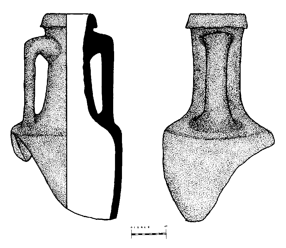 Gornji dio amfore. Obod je zakošen prema dolje i trokutastog presjeka. Vrat je blago konusan. Ručke su izdužene, ovalnog presjeka. Započinju ispod oboda i završavaju na naglašenom ramenu. Nedostaju tijelo i dno.