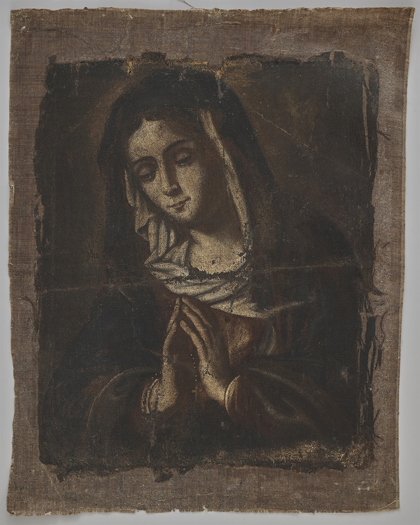 Djevica Marija sa spojenim rukama u molitvi. Glava spuštena. Pola lica i sijeni. Oči spuštene, kosa crna razdijeljena na čelu. Na glavi veo koji se spušta oko dekoltea. Na velu plašt tamni koji se spušta i pokriva i rukave. Haljina tamnocrvena. Pozadina tamnosmeđa. (Inventarna knjiga 1-3, 2. tom)