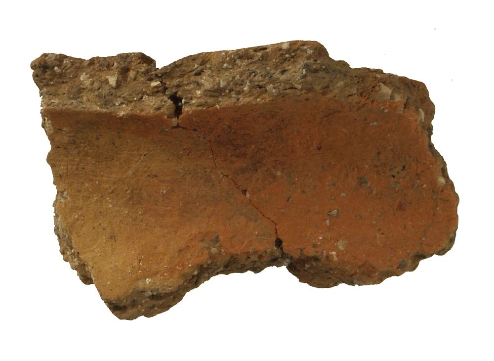 Ulomak kratkog i uvučenog vrata posude. Kreamika je tamnosmeđe boje i s puno primjesa kalcita.