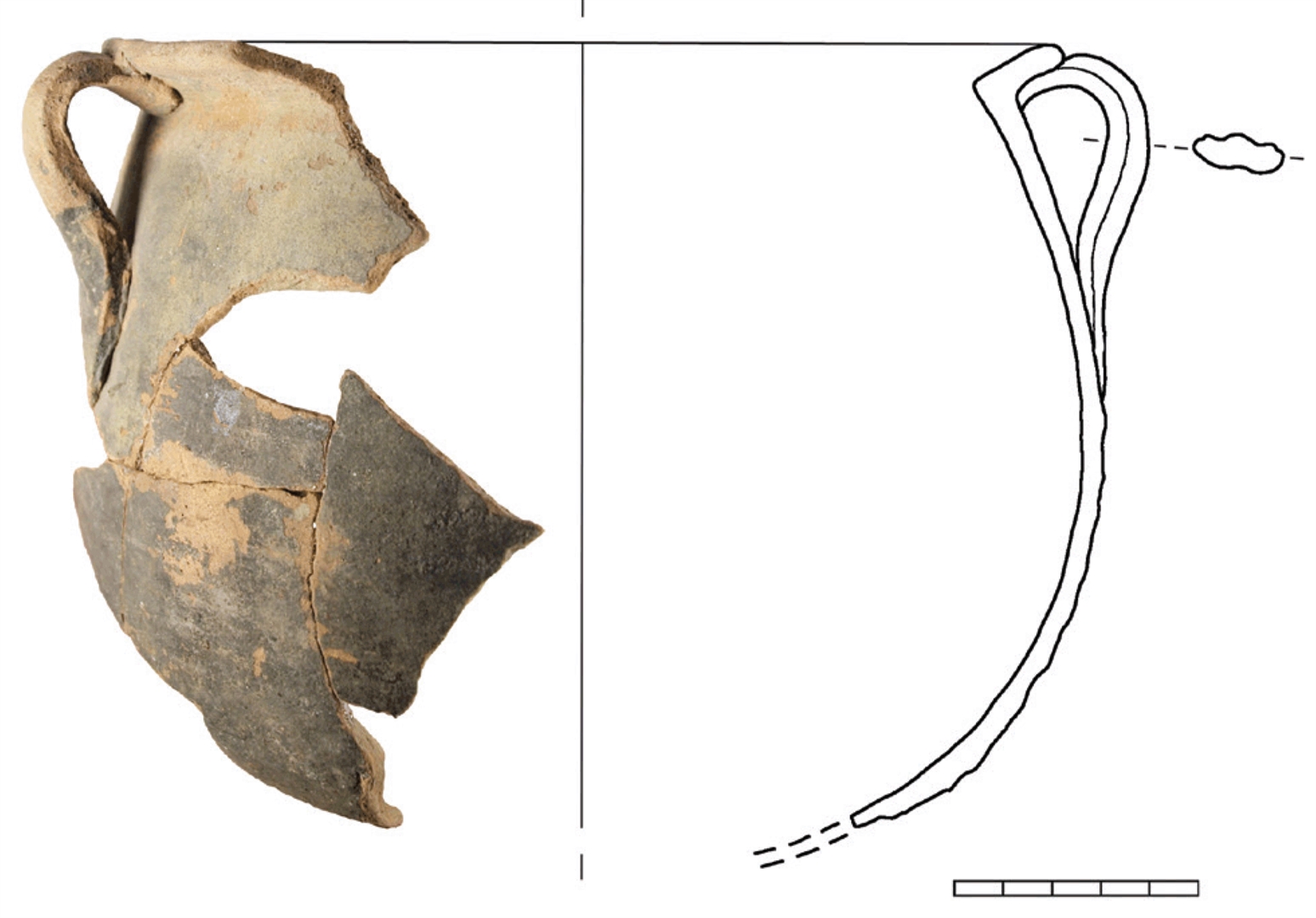 Fragmentirani lonac s ručkom. Sivo-narančasta glina s primjesama kvarca i sitnog pijeska. Izvana sloj gareži.