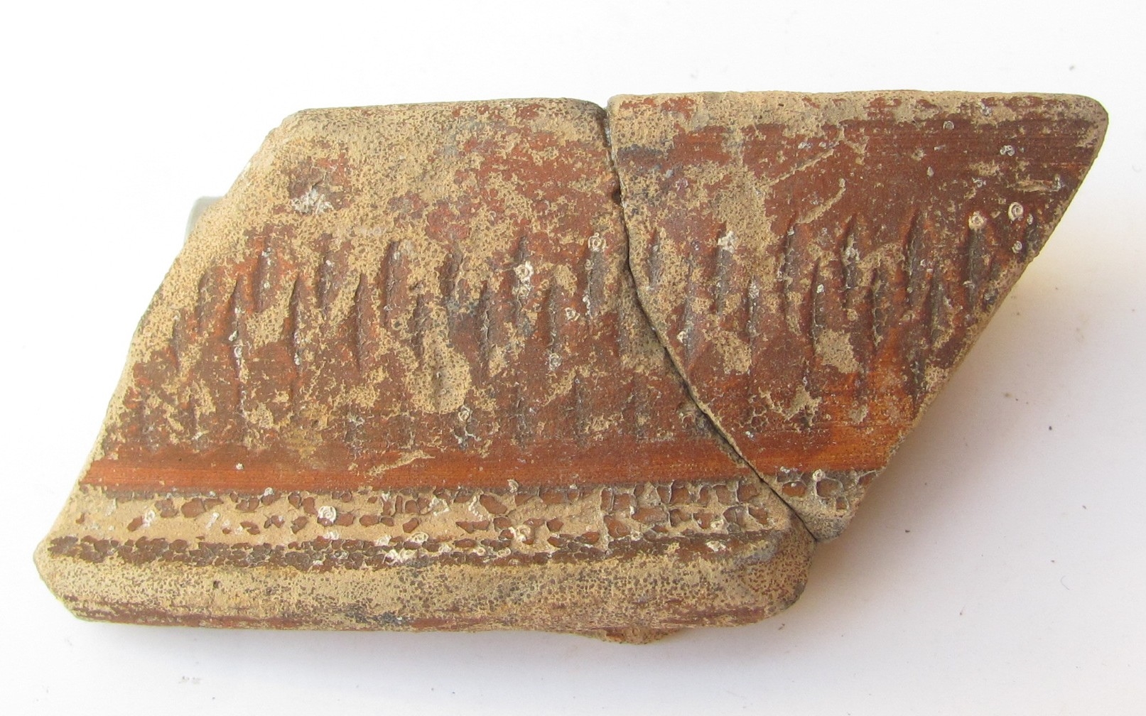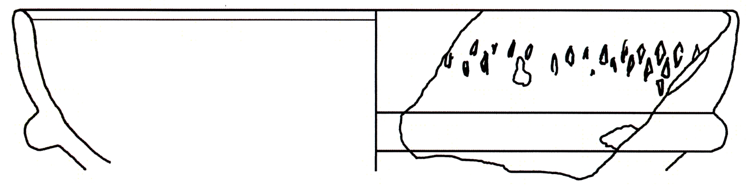 Ulomak oboda posude ispod kojeg se nalazi ukras od tri reda kosih crta izvedenih kotačićem.