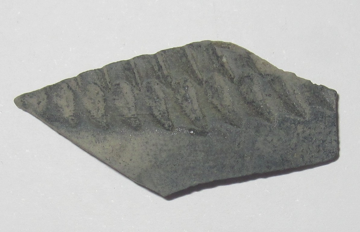 Ulomak tijela od sive keramika s lustrom od fino pročišćene gline. Ukrašen sa najmanje 2 reda kosih crta izvedena kotačićem. Sonda A, SJ 5.