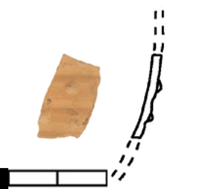 Ulomak trbuha šalice ukrašenog barbotin ukrasom. Keramika je svijetle boje izrađena od fino pročišćene gline.