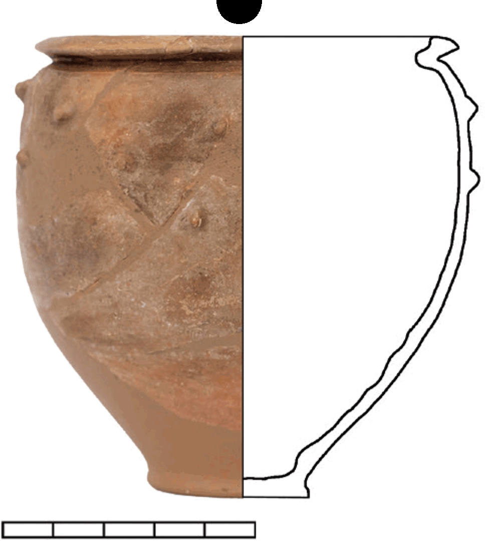 Ulomak šalice ukrašene barbotin ukrasom. Keramika je svijetle boje boje izrađena od fino pročišćene gline.