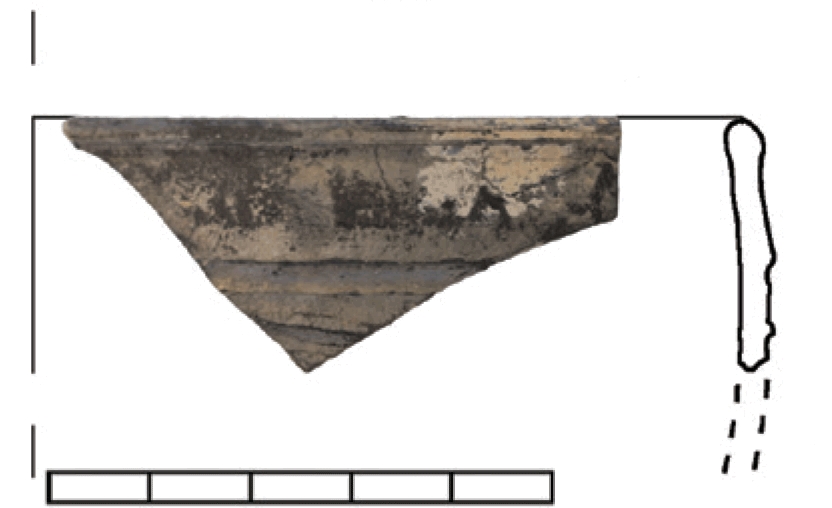 Ulomak prema unutra uvijenog oboda polukružne zdjele. Keramika je sive boje s lustrom od fino pročišćene gline.