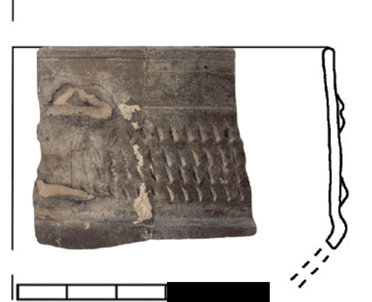 Ulomak oboda i trbuha bikoničnog pehara. Ukras se sastoji od četiri reda kosih crta izvedenih kotačićem. Keramika je sive boje s lustrom od fino pročišćene gline.