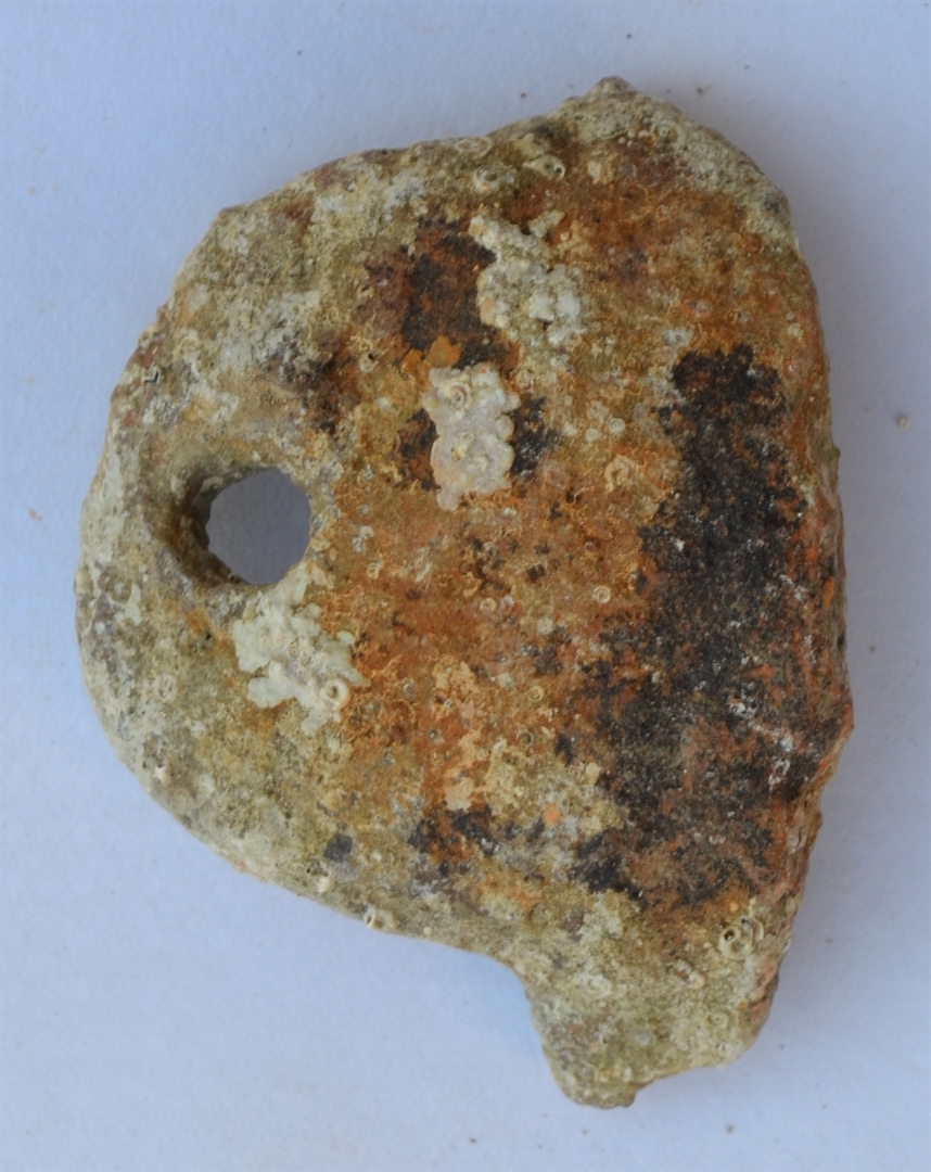 Zaobljena ručkica kotlića s rupom u sredini. Smeđa, dobro pročišćena glina.