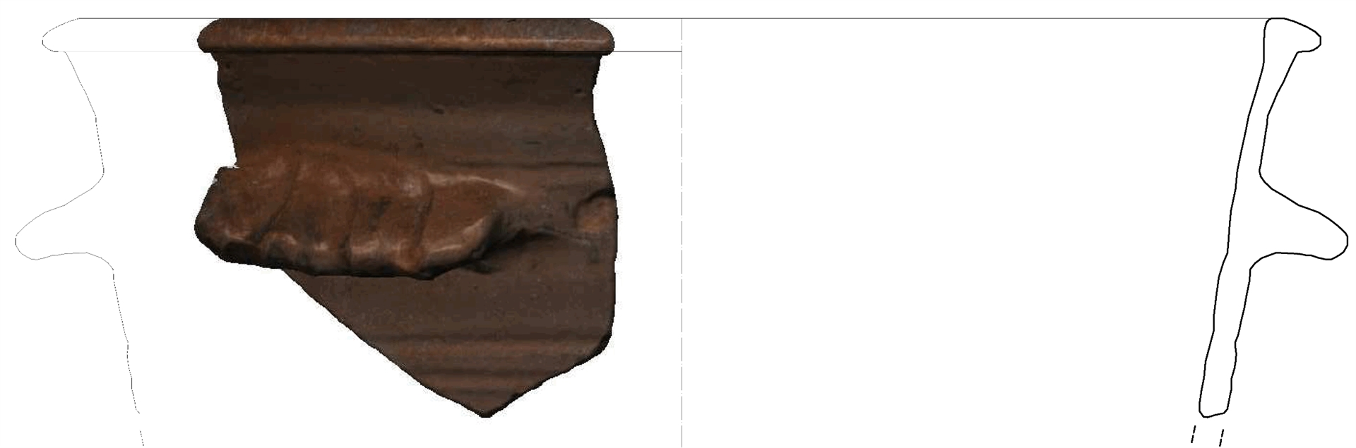 Zadebljani obod lonca. U presjeku trokutast. Ispod oboda se nalazi jezičasta ručkica s valovitim završetkom. Narančasta, dobro pročišćena glina.
