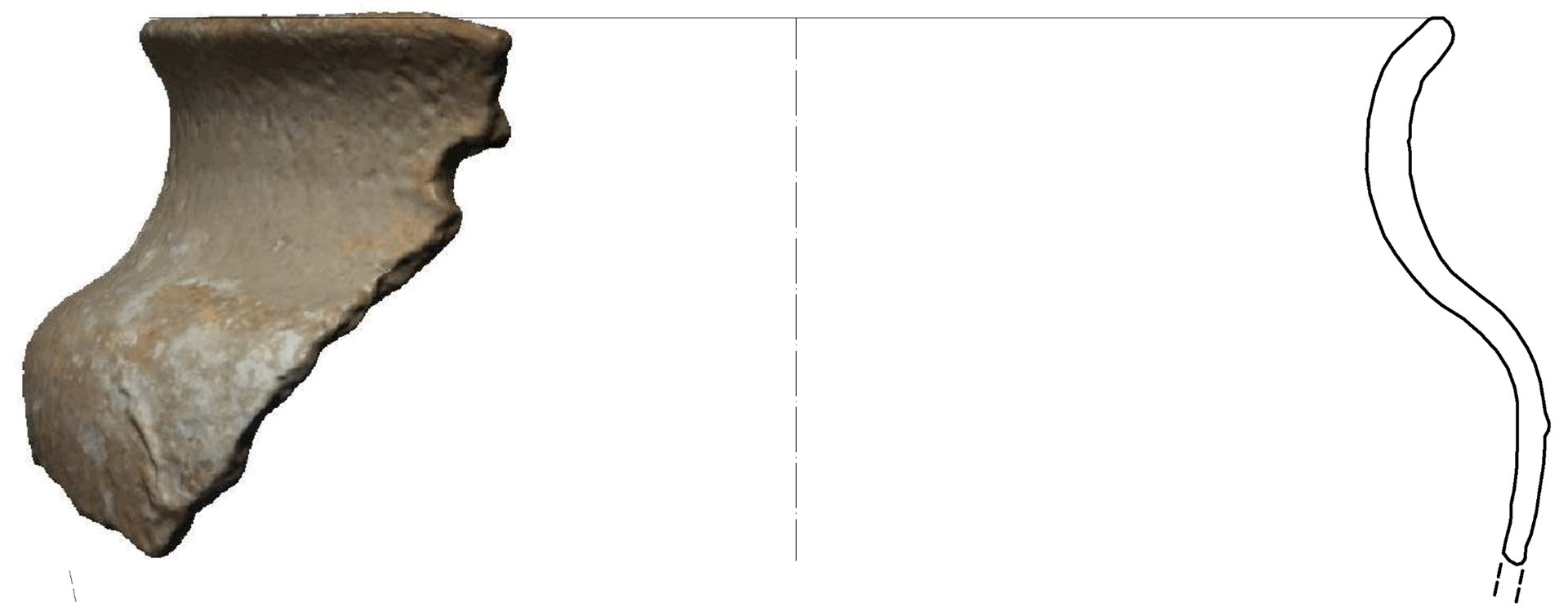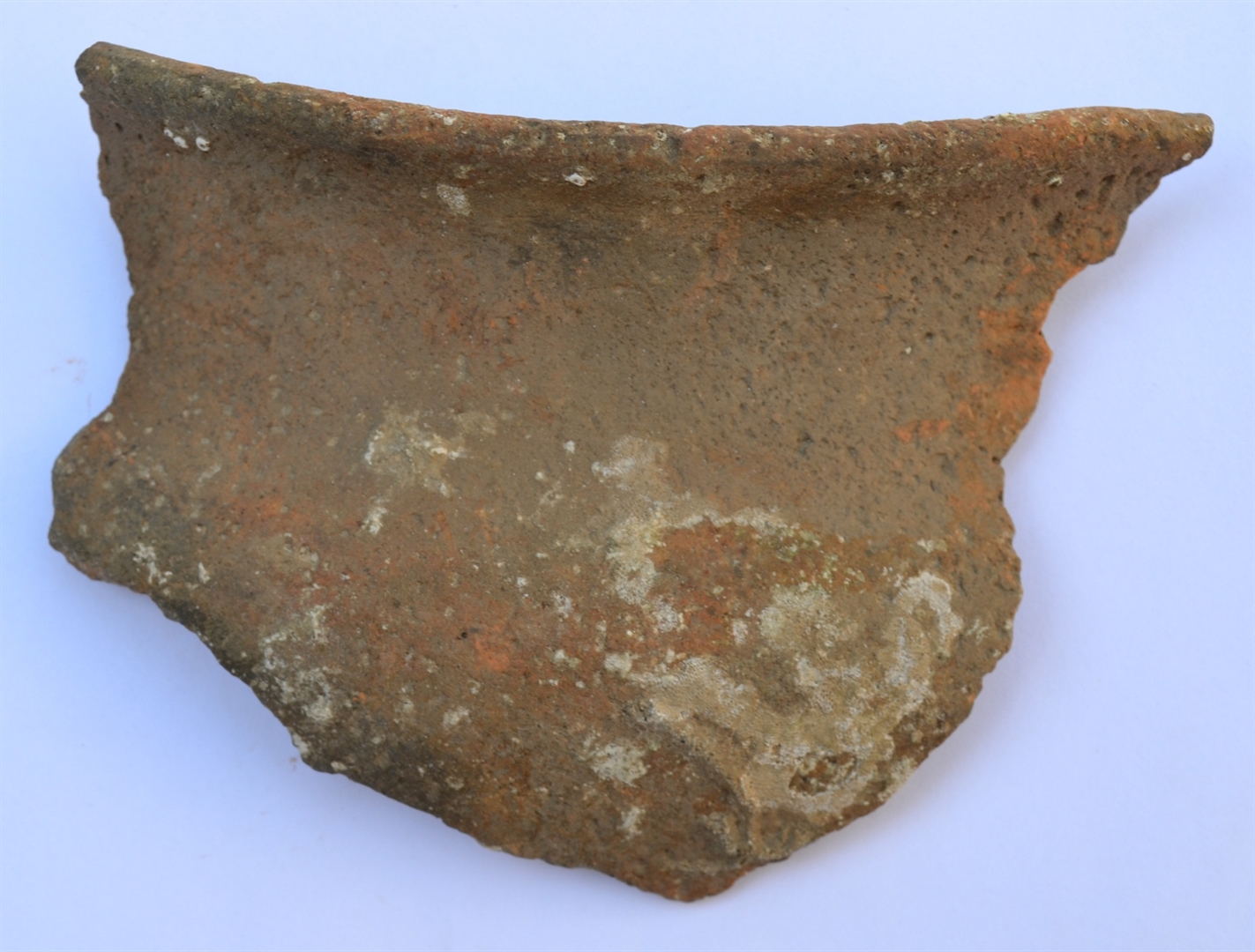 Ulomak izduženoj i lagano izvijenoga nenaglašenog oboda trbušastog lonca. Crvenkasta, porozna glina s malo primjesa.