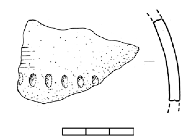 Ulomak trbuha posude s mnogo primjesa kalcita, crne boje. Ukras izveden nizom udubljenja.