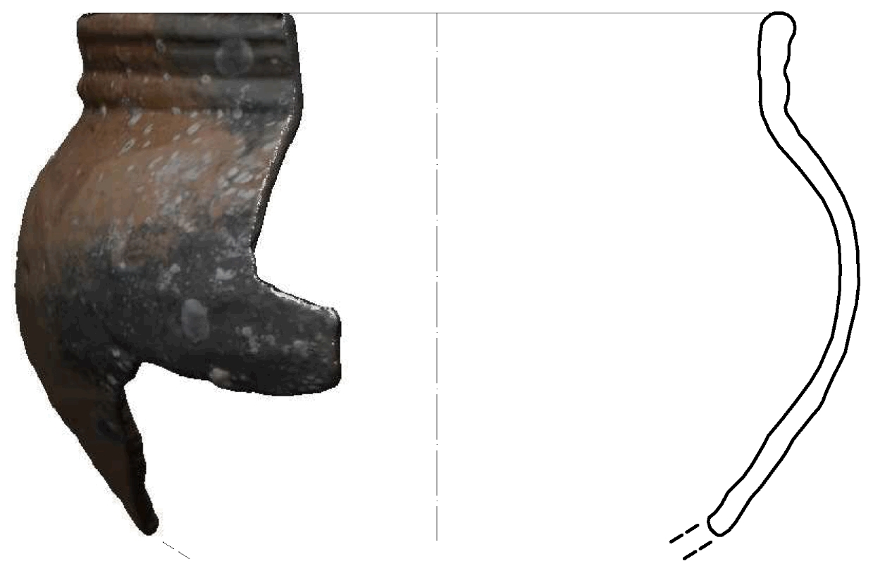Ulomak profiliranog oboda i stijenke trbušastog lonca. Na trbuhu se ocrtava trag ručkice. Crvena, dobro pročišćena glina, prozirna glazura s unutrašnje strane i na vanjskoj strani oboda