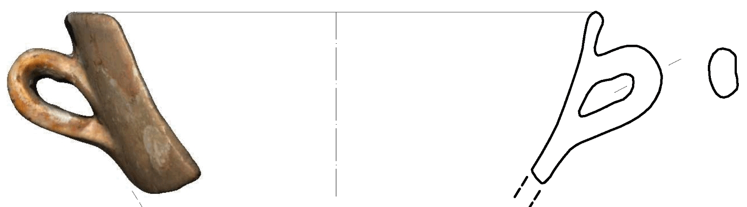 Ulomak nenaglašenoga oboda i stijenke trbušastog lončića. Ispod oboda se nalazi trakasta ručkica. Crvena, dobro pročišćena glina, prozirna glazura s unutrašnje i vanjske strane.