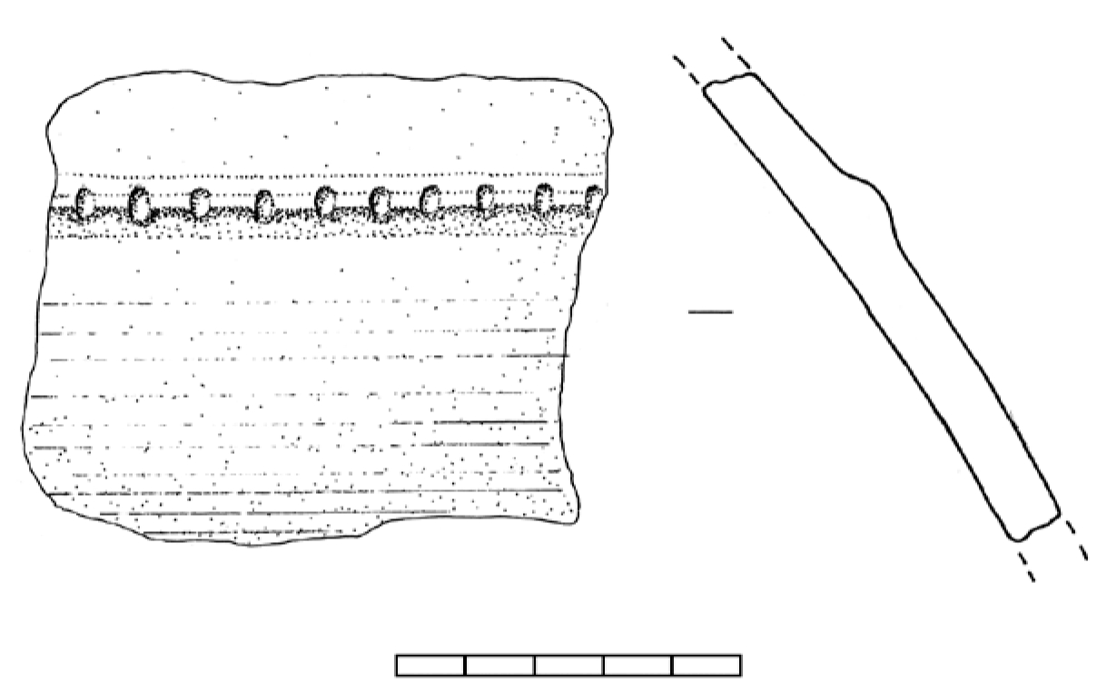 Ulomak trbuha posude s mnogo primjesa kalcita, izvana crveno do narančasto, a u prijelomu i iznutra tamnocrvene boje.